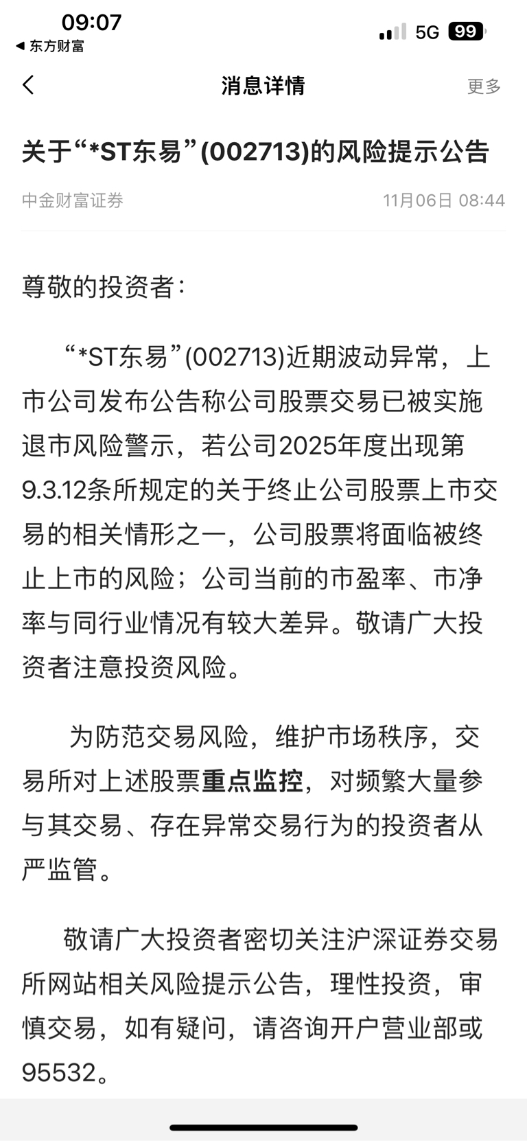 $*ST东易(SZ002713)$ 一早又收到ST东易的监控公告!有退市风险提示