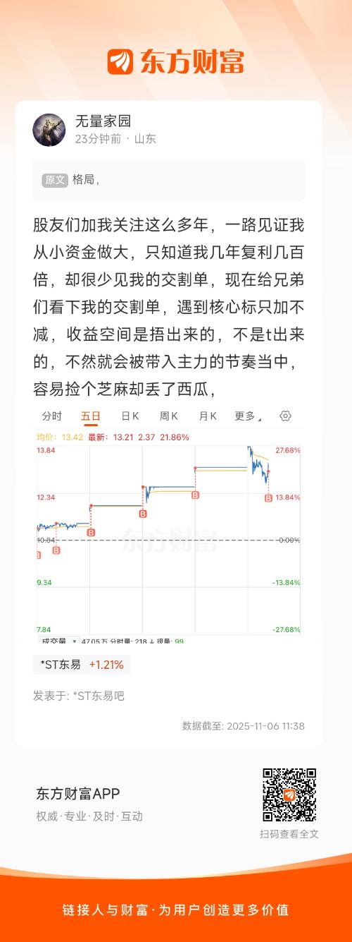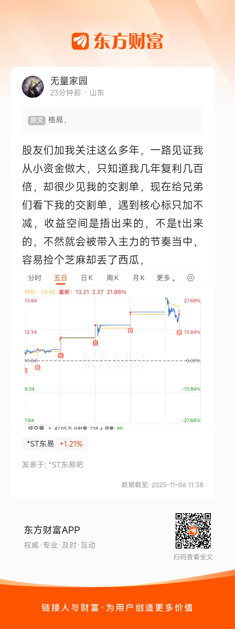 //@无量家园 :股友们加我关注这么多年,一路见证我从小资金做大,只知道我几年复利几百倍,却很少见我的交割单,现在给兄弟们看下我的交割单,遇到核心标只加不减,收益空间是捂出来的,不是t出来的,不然就会被带入主力的节奏当中,容易捡个芝麻却丢了西瓜,