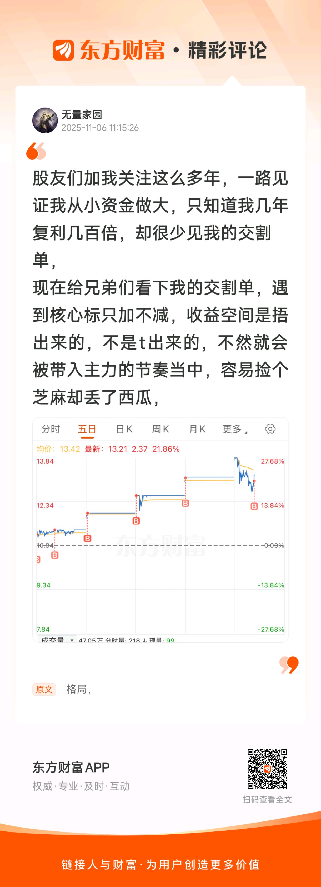 //@无量家园 :股友们加我关注这么多年,一路见证我从小资金做大,只知道我几年复利几百倍,却很少见我的交割单,现在给兄弟们看下我的交割单,遇到核心标只加不减,收益空间是捂出来的,不是t出来的,不然就会被带入主力的节奏当中,容易捡个芝麻却丢了西瓜,