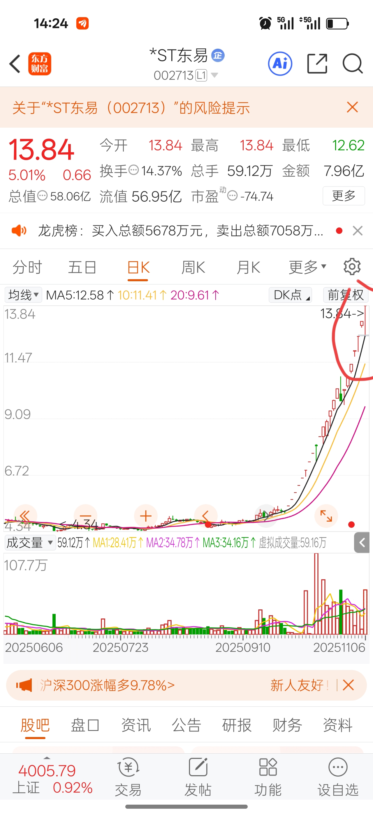 $*ST东易(SZ002713)$ 看他每天摇摇晃晃的,摇摇欲坠的感觉,可它又偏偏每天都涨停,气不气?今天碰到五日线就大长腿起来,五日线为地,要想盖的房子越高越稳固地基就得牢不能悬空。看下这个日k像不像盖楼房的一根顶梁柱。