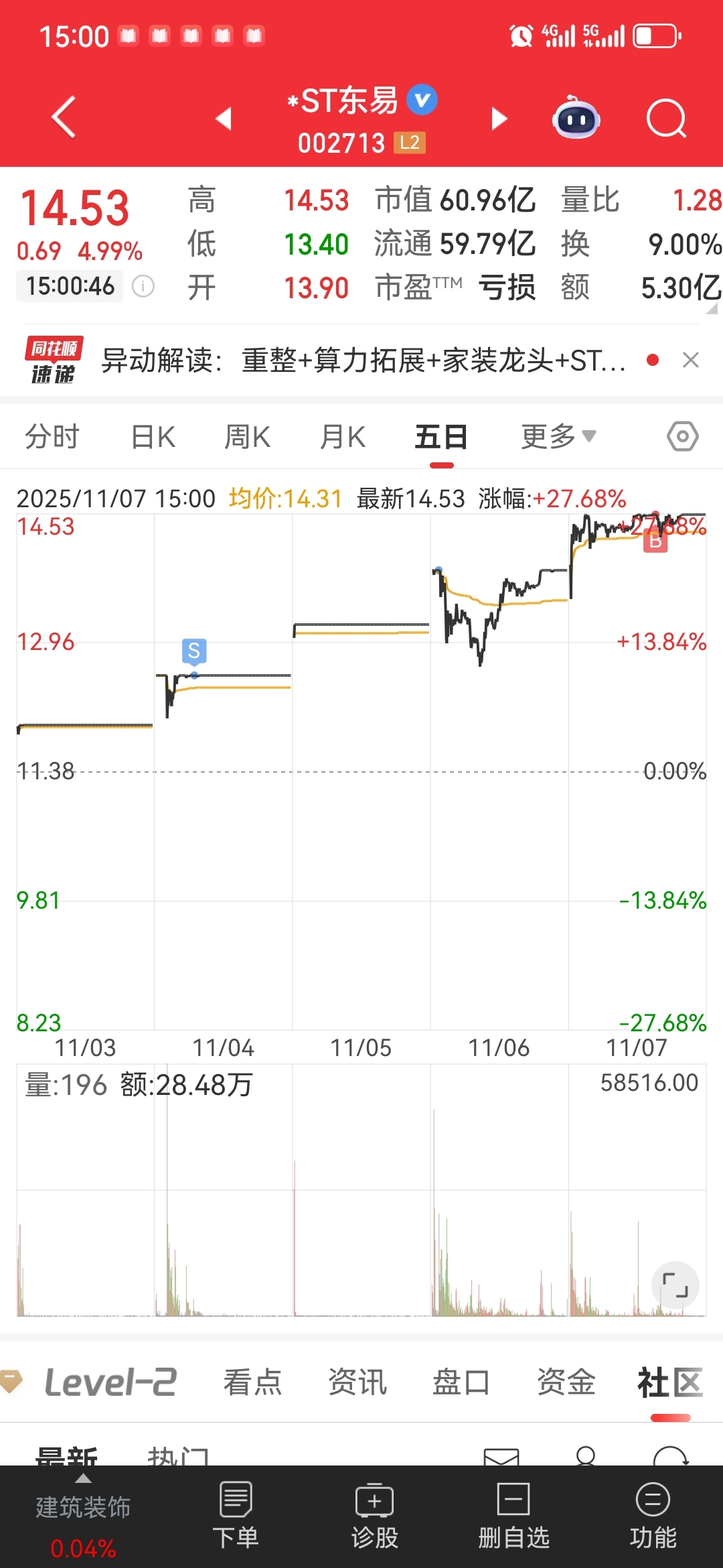 $*ST东易(SZ002713)$ 这阵子做了个低抛高吸,成本提高了不少,但我不后悔,我是纯短线,看市场情绪,逻辑之类的我看不来