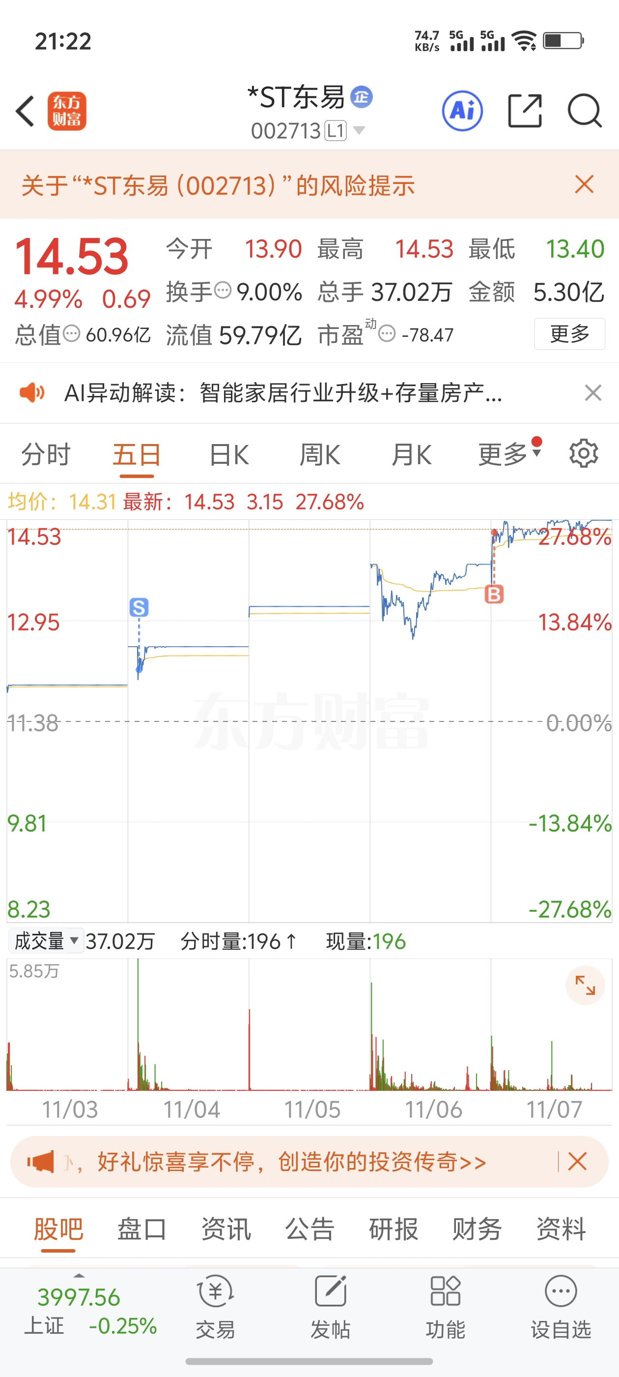 $*ST东易(SZ002713)$ 深v洗盘扛不住卖了怕第二天跌停出不来,今天支持了一手,买少了