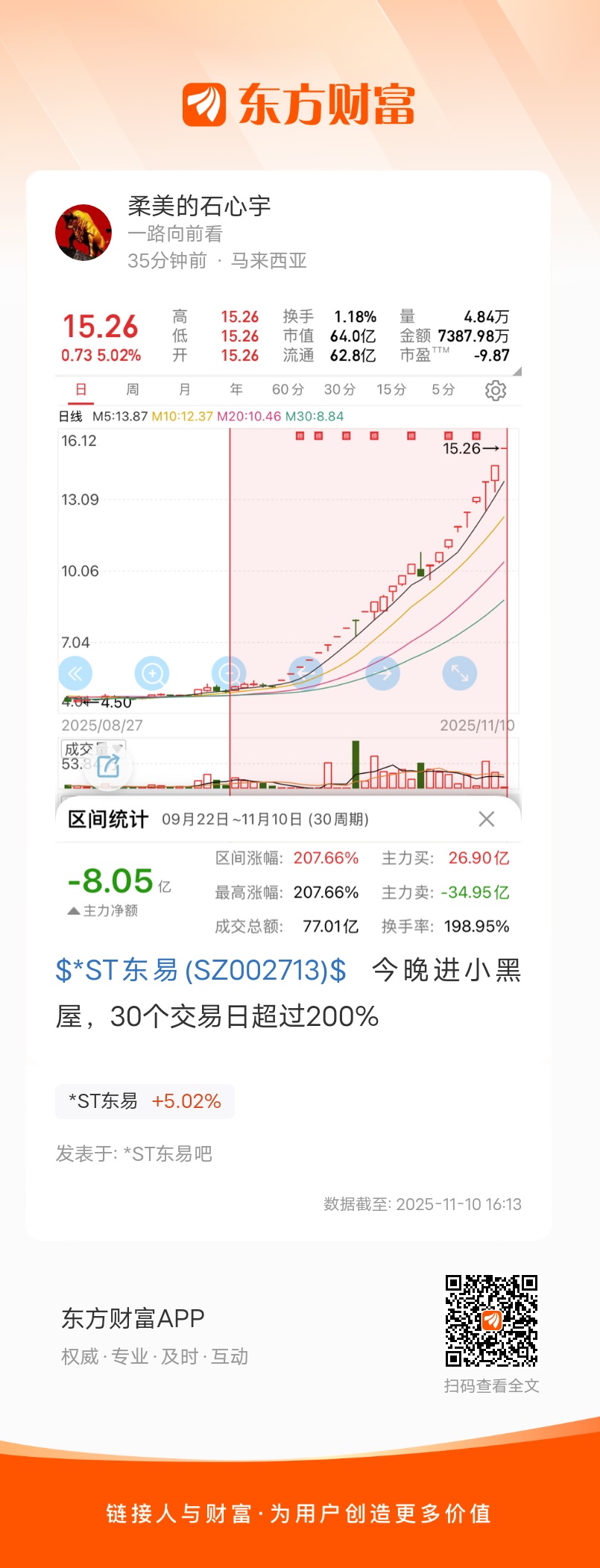 $*ST东易(SZ002713)$  今晚进小黑屋,30个交易日超过200%