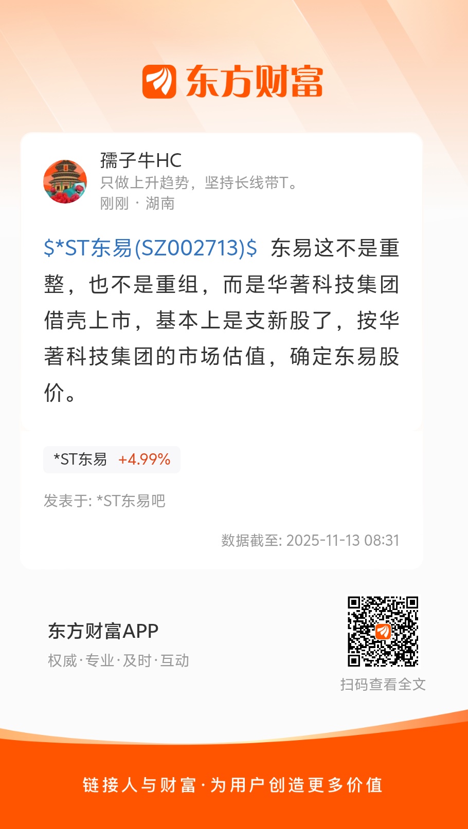 $*ST东易(SZ002713)$ 东易这不是重整,也不是重组,而是华著科技集团借壳上市,基本上是支新股了,按华著科技集团的市场估值,确定东易股价。