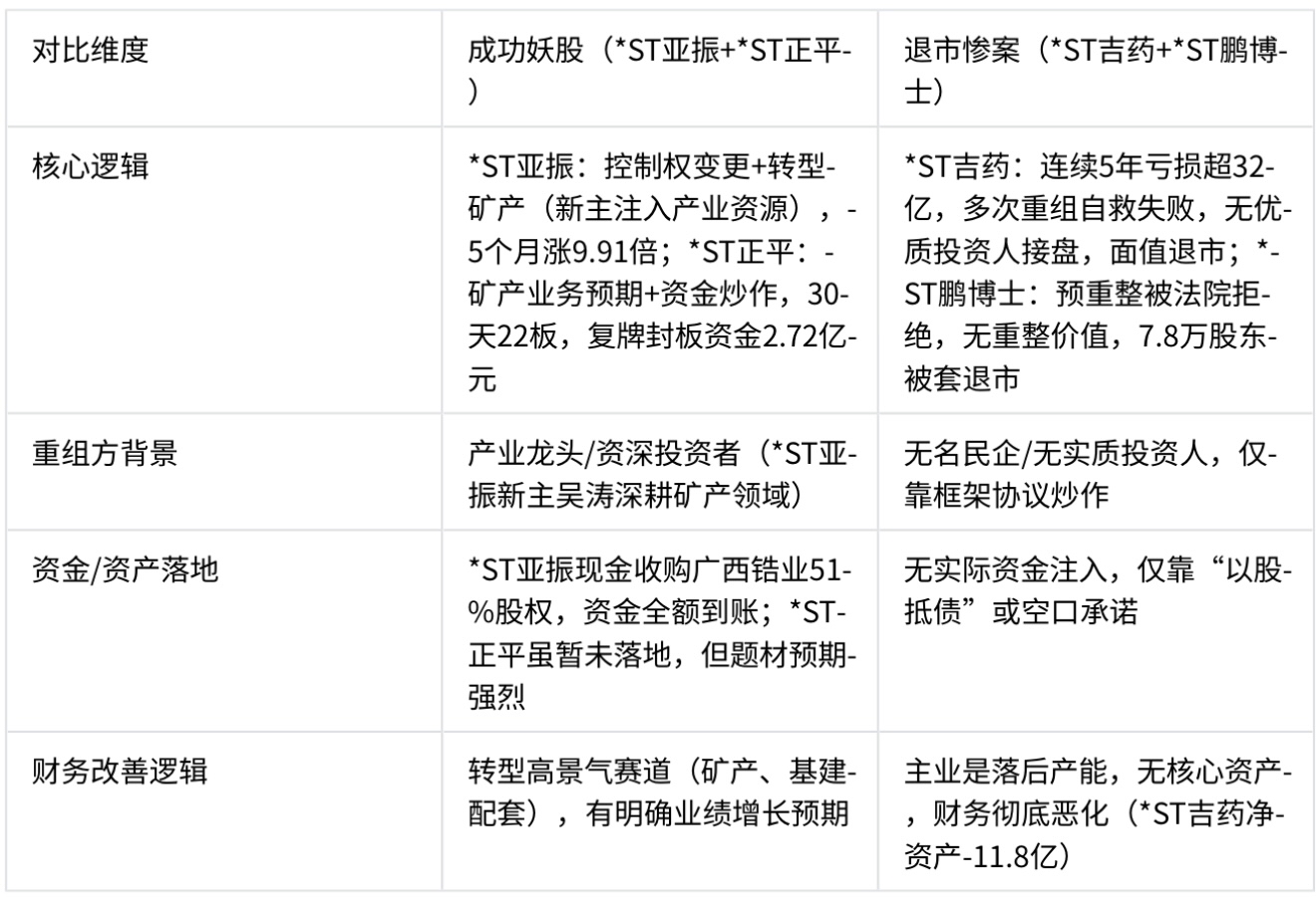 2025年的重整重组行情,早已不是“炒壳”时代,而是“真困境+真资源+真进展”的三重共振。*ST亚振的10倍神话、ST正平的22板狂欢,本质都是“优质重组方+实质预期+资金共振”的结果;而ST吉药、*ST鹏博士的退市惨案,则警示我们脱离基本面的炒作终将一地鸡毛.....