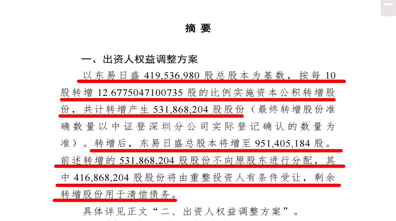 东易此次重整对应的除权比例约为每10股转增12.68股(10.10日公告里有,见下图)。按该比例,公司将转增出约5.32亿股股份,转增前总股本约4.2亿股,转增后总股本会增至约9.51亿股。且这些转增股份不向原股东分配,全部用于引入重整投资人以及清偿债务。目前公司除权概率极高,不过最终除权参考价还需结合多种因素核算确定。