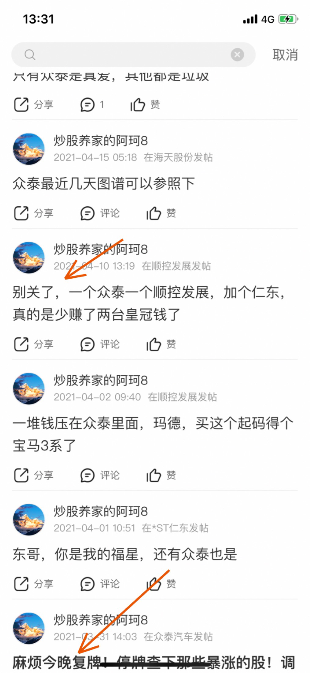 $*ST东易(SZ002713)$ 你们知道我当年买众泰进过多少次小黑屋吗?炒这种ST龙头全靠信仰,看我当年在众泰吧的发帖。当年我月月关小黑屋,天天重点监控,天天异常波动,众泰股吧全是喊退市的空苟骗筹码(东易停牌三天,今天一堆人被骗筹码)