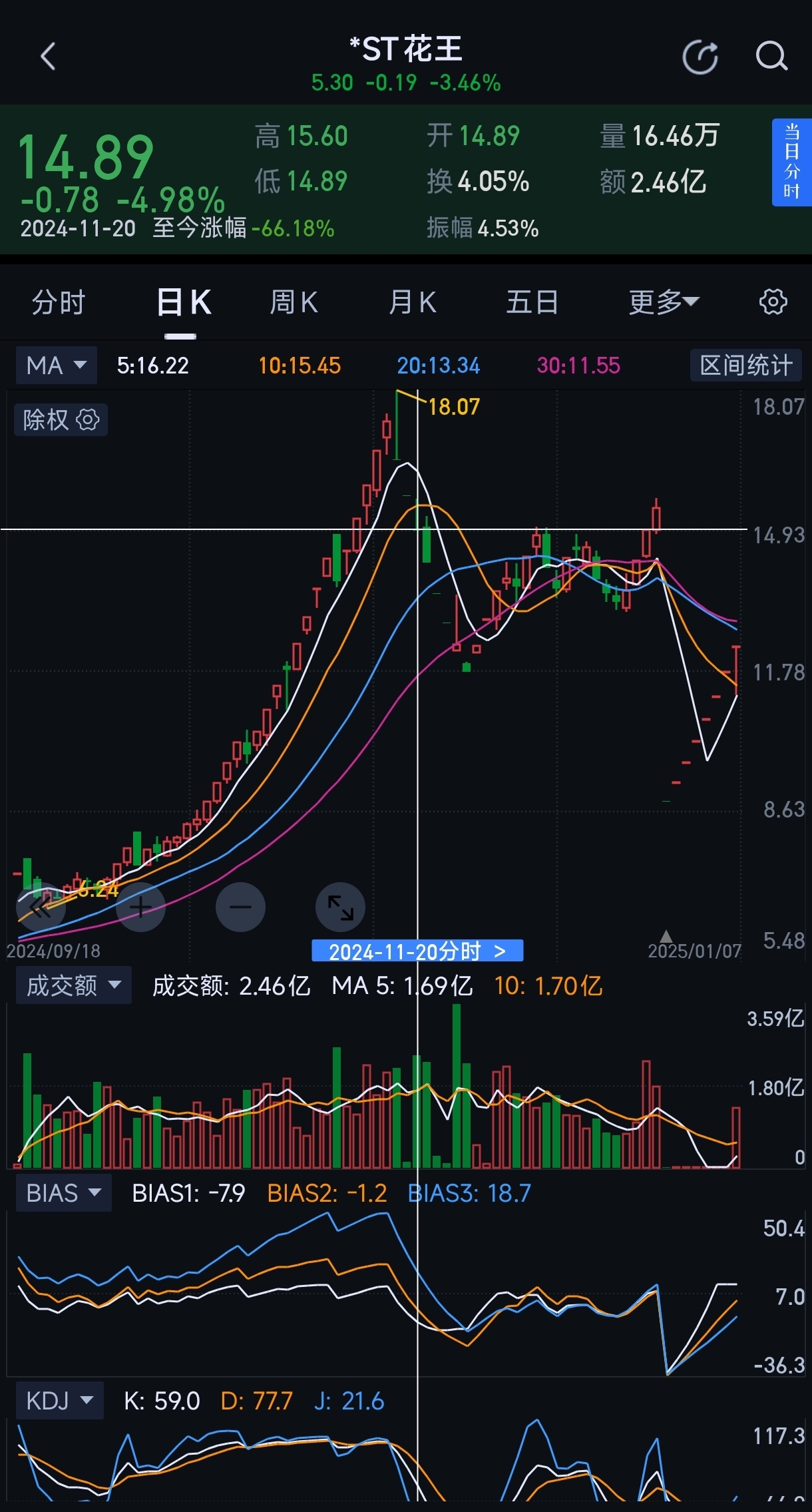 *ST花王。2024年11月15号收到被法院确认重整,2024年11月18号开盘