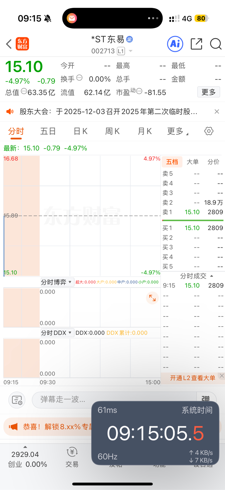 $*ST东易(SZ002713)$ 开盘第一时间才19w封单,后面苟东西慢慢加单