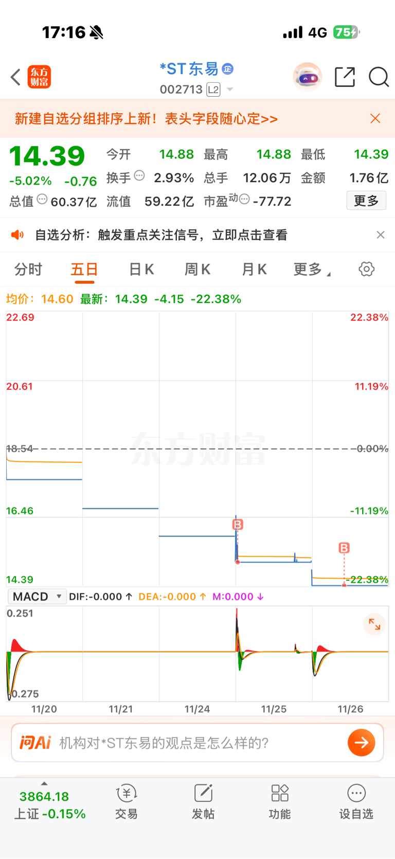 $*ST东易(SZ002713)$ 每天跌停板买几手,万一哪天就启动了呢