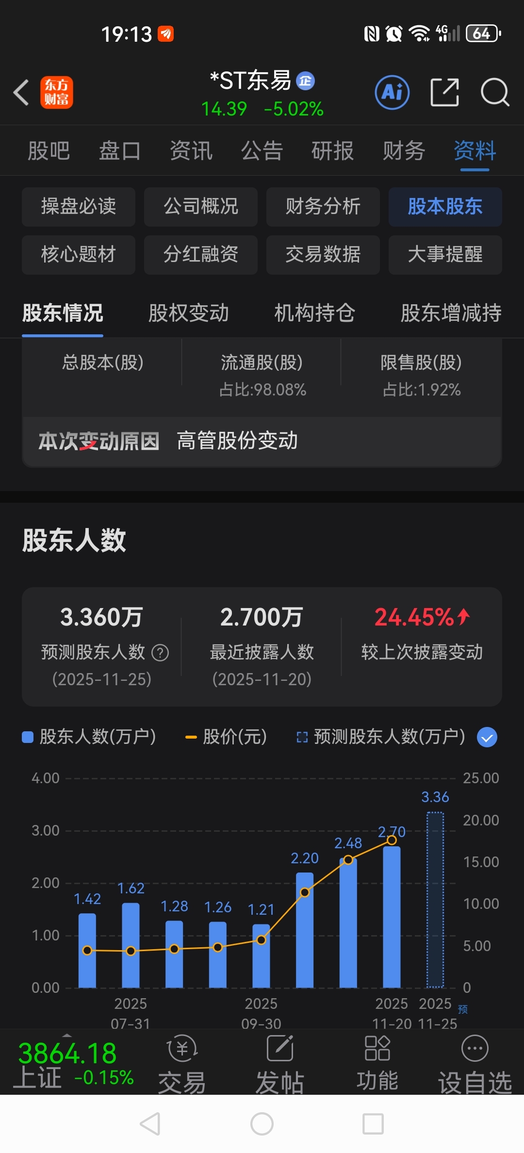$*ST东易(SZ002713)$ 股东人数怎么会上升怎么快速?