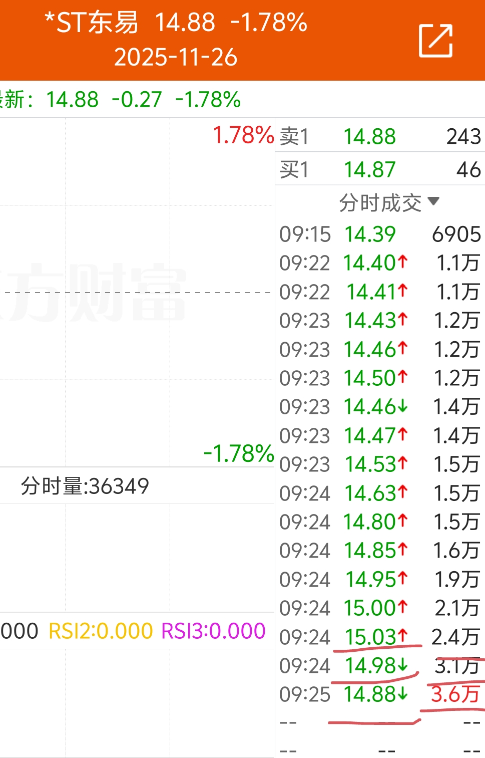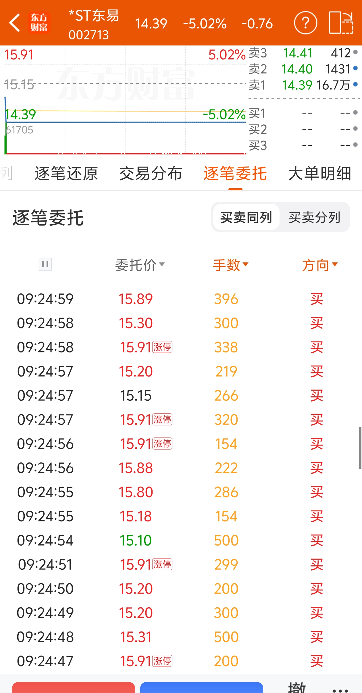 $*ST东易(SZ002713)$ 今天竞价9点24分50多秒,明显被资金引导了,挂跌停有几串程序拖拉机单卖出。昨天10个亿都成交了,没封死跌停,今天有必要抢跑?该卖的昨天还没卖完?可能昨天大资金筹码卖的丢了很多,今天没空间接回,用手里仅存的筹码,砸竞价最后几秒,引导昨天翘板资金,多杀多,如果不这么引导一下,今天开盘就抢红盘了,那么昨天抄底的就加仓或者锁仓,而不是开盘止损多杀多,那么今天就是昨天中迪的拉高秒涨停。