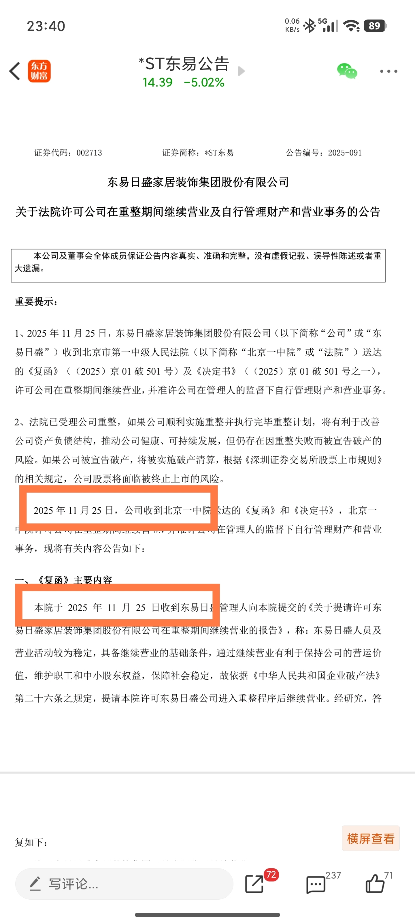 $*ST东易(SZ002713)$ 这个公告有意思。看落款时间,昨天就要发出来的,结果硬拖了一天才发出来。是交一锁卡了一天?还是公司为了股价延迟一天发公告?