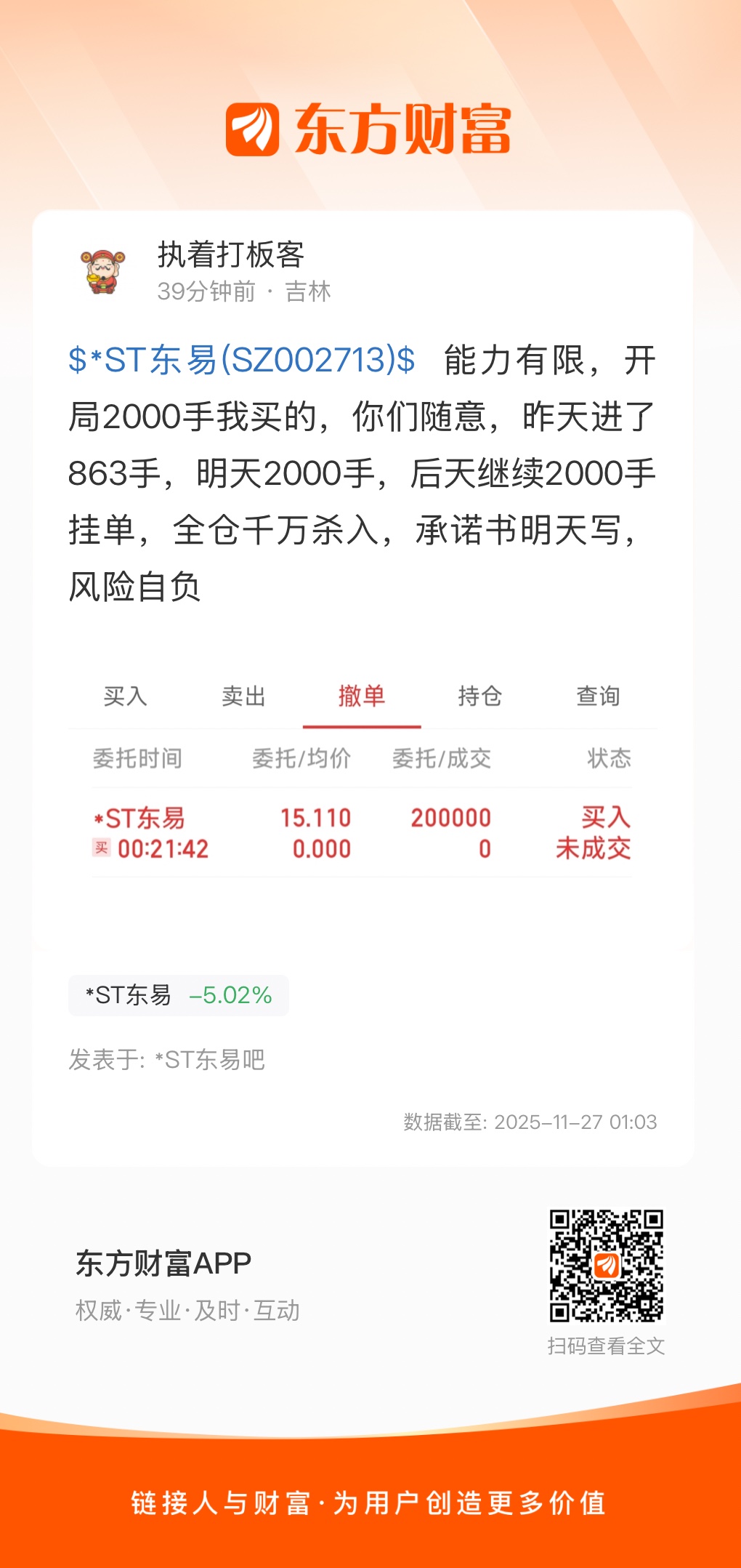 $*ST东易(SZ002713)$ 能力有限,开局2000手我买的,你们随意,昨天进了863手,明天2000手,后天继续2000手挂单,全仓千万杀入,承诺书明天写,风险自负