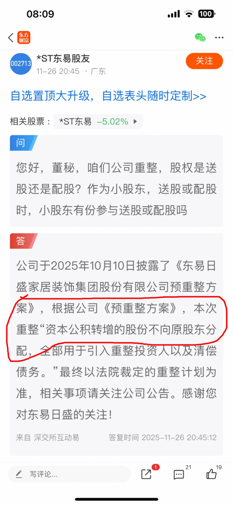 $*ST东易(SZ002713)$ 董秘昨晚公告实锤了重整后不向原股东送股!那么今天公司的前十大股东不集体出逃才怪呢!账户无缘无故损失60%的市值!哎!真是屋漏偏逢连夜雨…