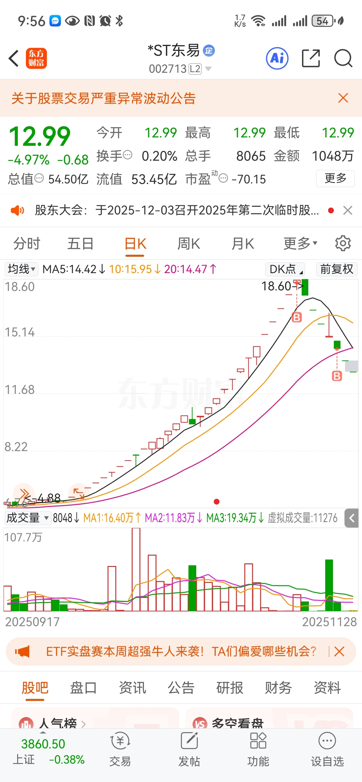$*ST东易(SZ002713)$ 高位追进来的,硬抗了好几天,想不明白换手上来的票为何这种走法!既然这样每天挂卖单,抱着一起下杀。出去以后再也不碰这种票!!!
