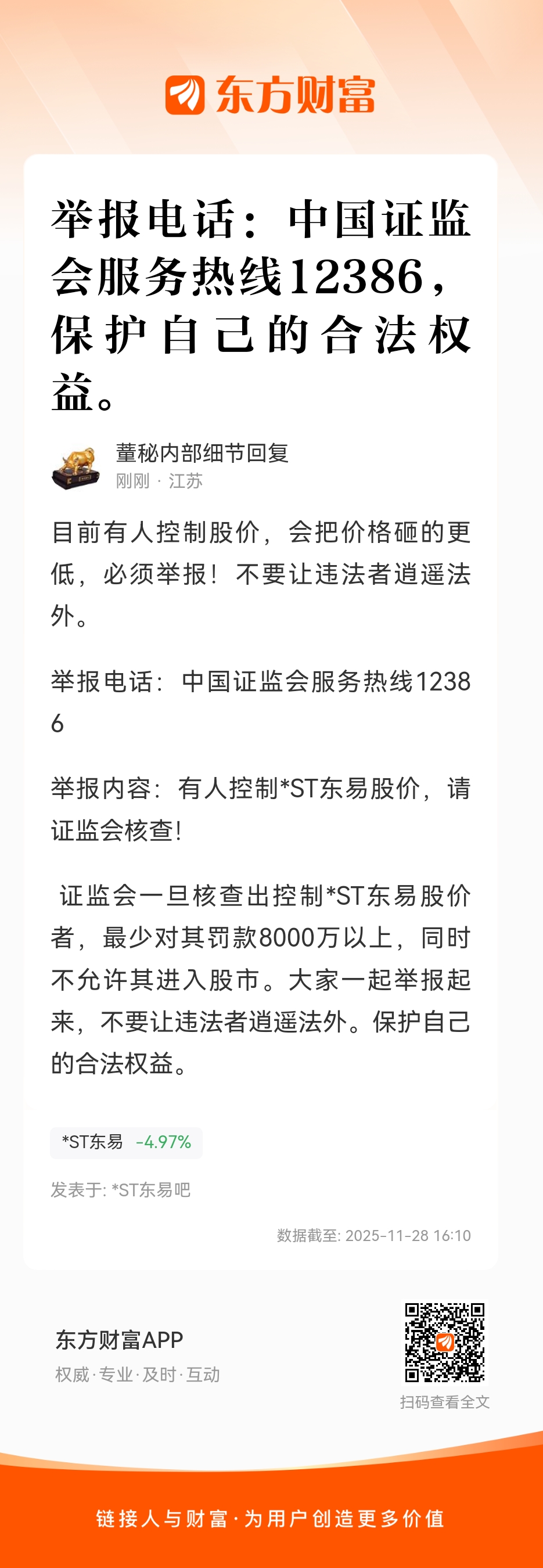 证监会一旦核查出控制*ST东易股价者,最少对其罚款8000万以上,同时不允许其进入股市。大家一起举报起来,不要让违法者逍遥法外。保护自己的合法权益。
