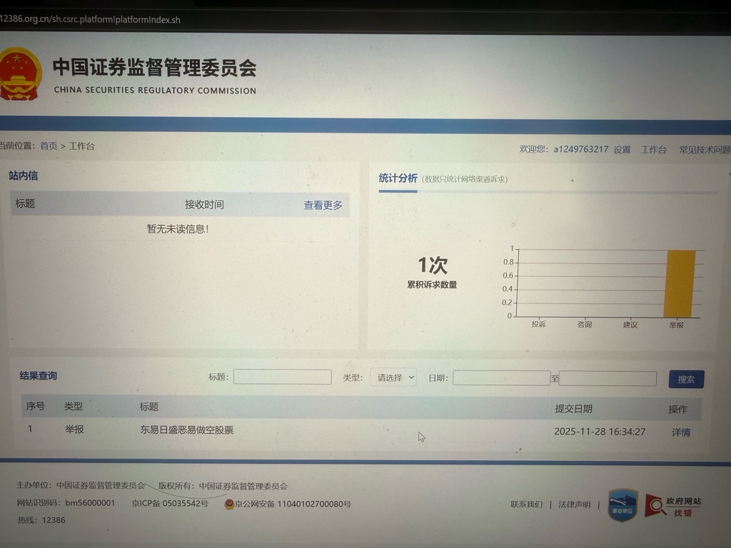 $*ST东易(SZ002713)$ 根据我以前登录网站,举报万方成功受理,限制大额订单卖出 操控股价经验!我帮你们编辑 你们只需上传相关证据即可 把董秘公告和大额封单截屏上传其一:除权暂时不确定的情况下,恐吓投资者,造成市场恐慌踩踏,有恶意操控股价嫌疑!同时有恶庄,明知成交量微小 无人接得住盘,每天利用集合竞价 挂几亿封单 压低股价 操控股价,几个亿的封单谁能承接 明显操控股价!其二:连续跌停几天,公司如无其事,不找问题根源:在除权时间不确定恐吓投资者抛盘!发些逃避责任的公告,火上浇油,极度不负责任!打电话没用的,我以前打过,客服会让你登录网站,自己填写举报内容,证据!最好实名举报,我试过,很管用,都会出处理结果!【证监会12386服务平台】这有网址,有空自己可以填!人多力量大!登录“证监会官网-互动交流-12386服务平台”(网址:fwpt.csrc12386.org.cn)提交您们的诉求,那边有人第一时间为您们处理!