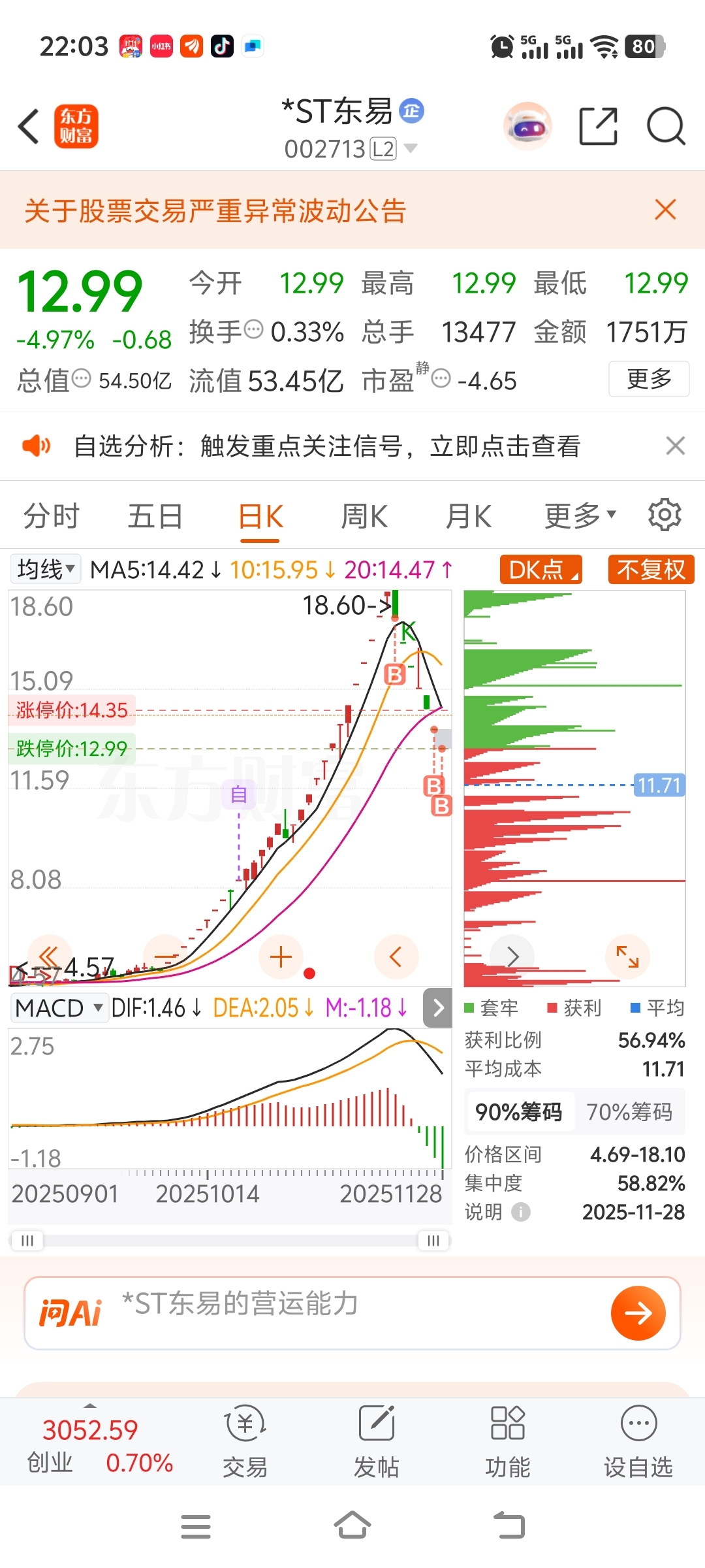 $*ST东易(SZ002713)$ 不出意外,周一周二还是跌停,因为我还没有变成空头,都在卖,只有我还脑子发热往里冲