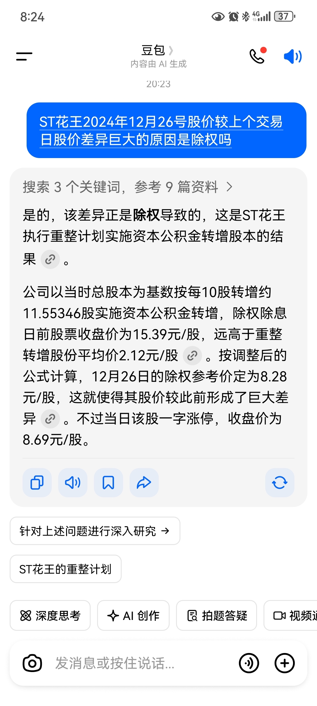 ST花王2024年12月26日较上个交易日股价差异巨大的原因,是不是除权原因,问