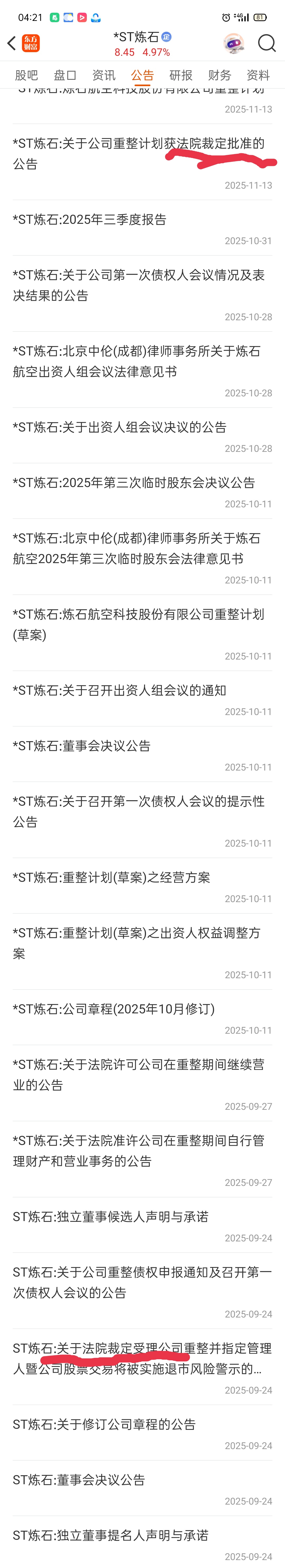 $*ST东易(SZ002713)$ st烁石从裁定受理到裁定批准刚好是50天时间。