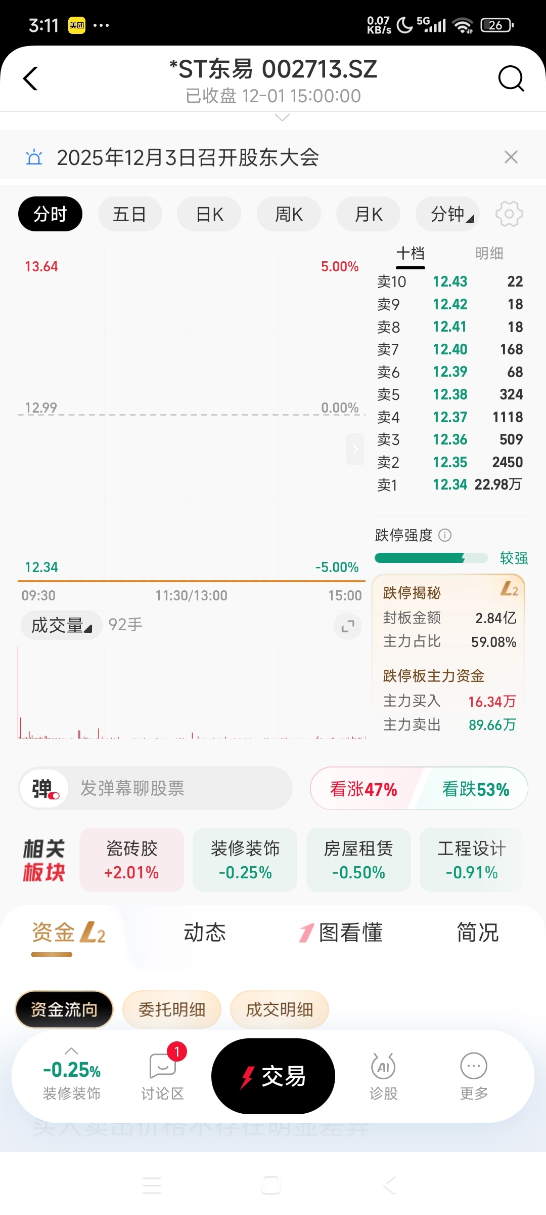 $*ST东易(SZ002713)$ 不用猜每天多少单是散户挂的,多少是主力挂的了,但凡开个软件会员也看的一清二楚,一直都是三分之二主力,三分之一散户,主力2.6个亿,散户1.3个亿左右,每天下午主力撤8,9万手一个亿左右的单,我观察过了,每天都这样。