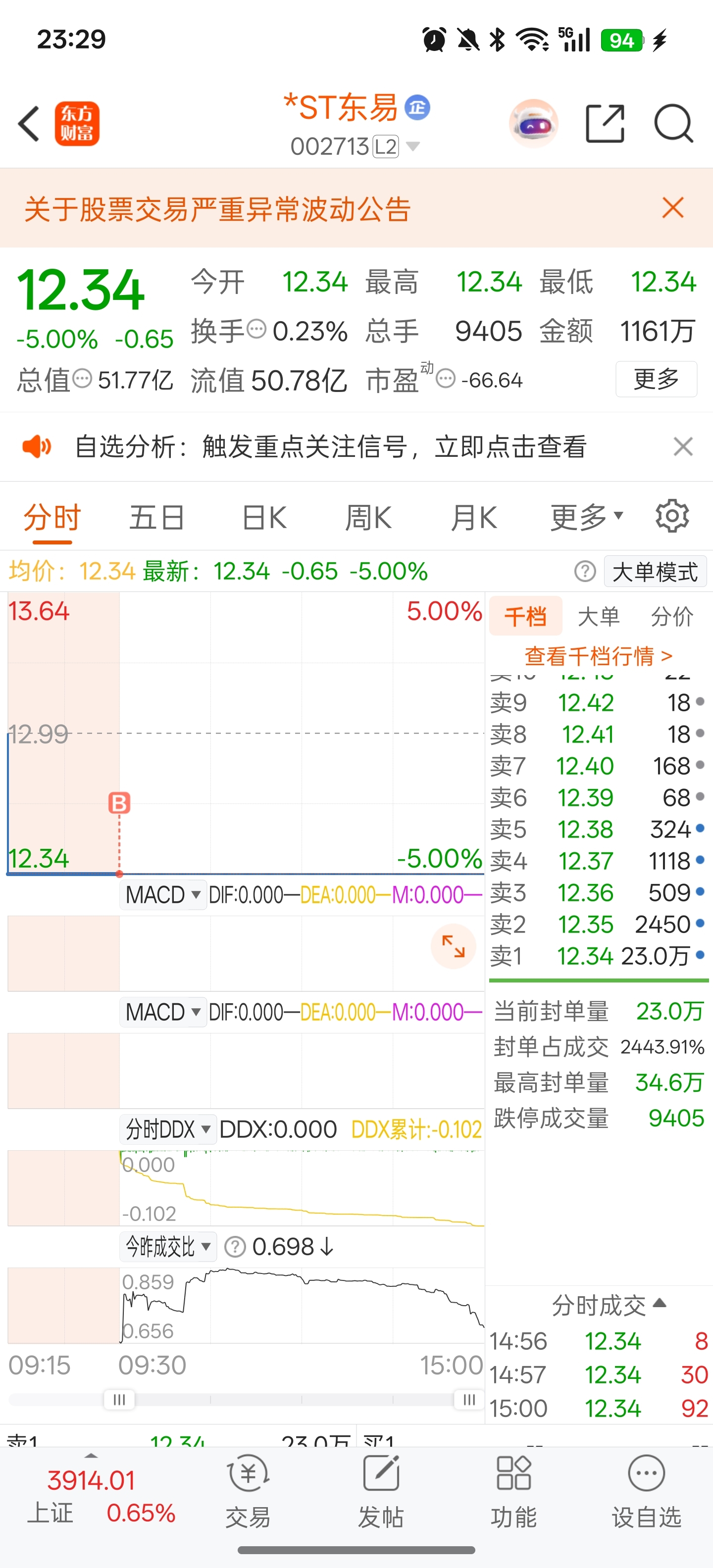 $*ST东易(SZ002713)$ 先买一手。里面的朋友们,不用太担心了。等开板就加仓,拉低成本反弹走人就是啦,这个位置,越跌越买。