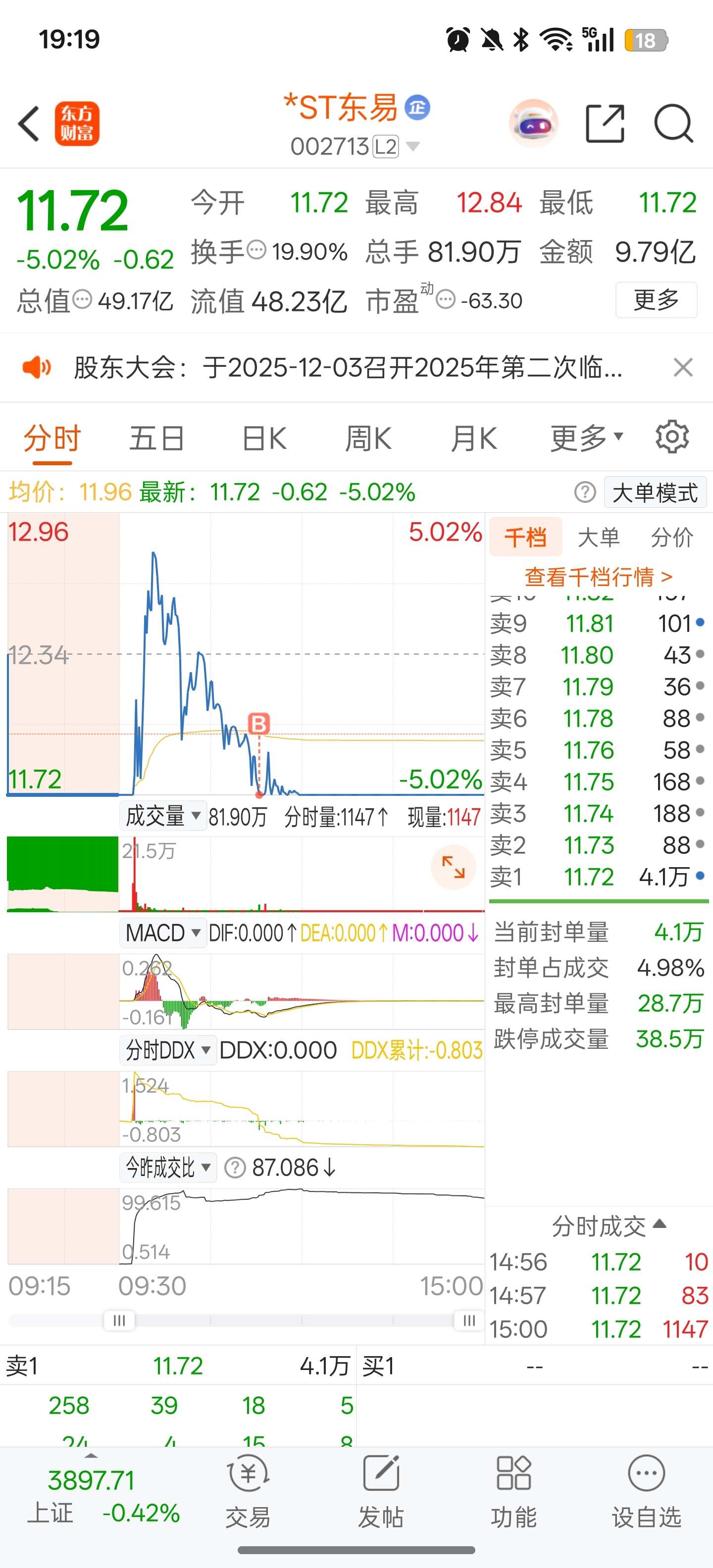 $*ST东易(SZ002713)$ 本来以为错过了翘板,主力释放了一些恐慌盘后又回封跌停,正式建仓东易。跟随资金,等抛压小了继续加仓,下一笔加仓等待中。