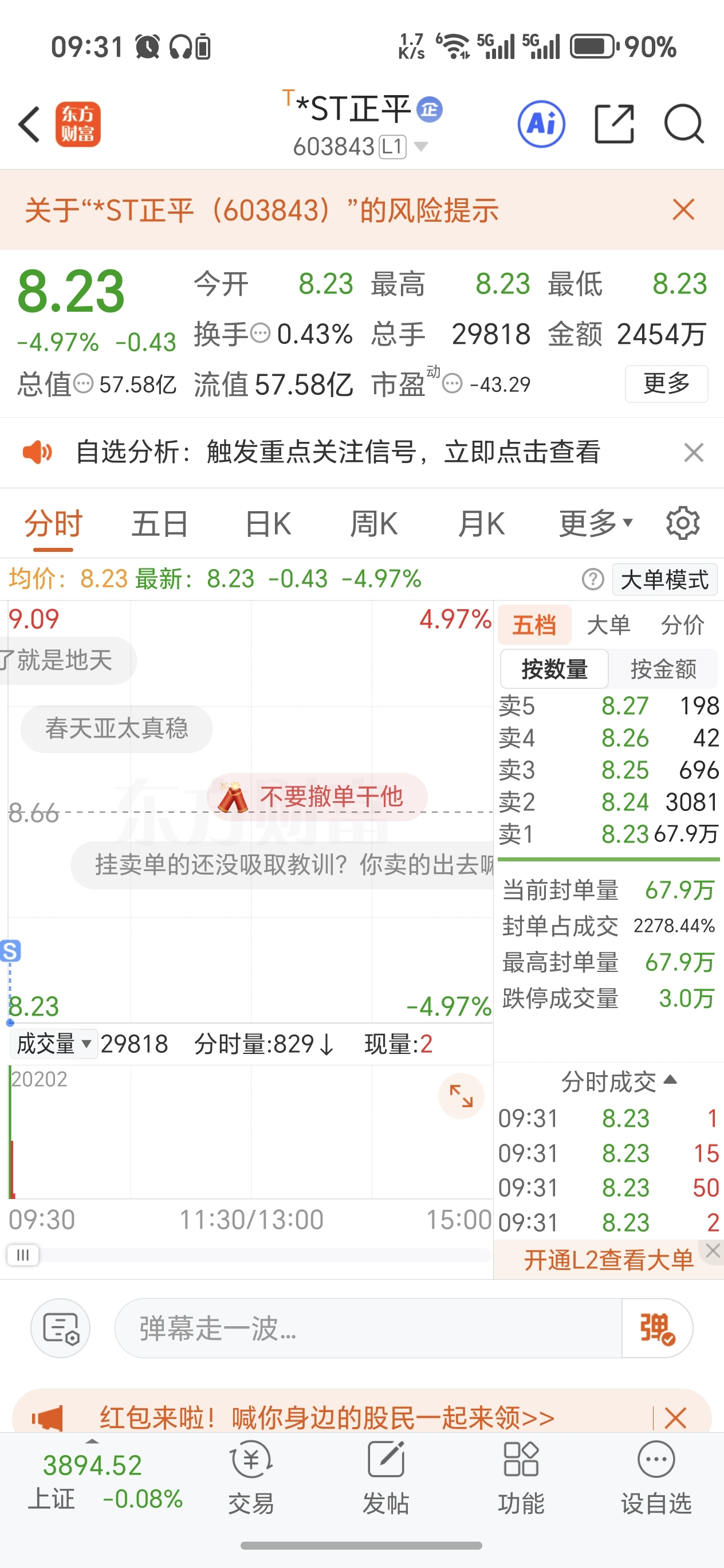 $*ST东易(SZ002713)$ 东易没跑吃了十个地板,被搞怕了,还好正平挂单早跑出来了