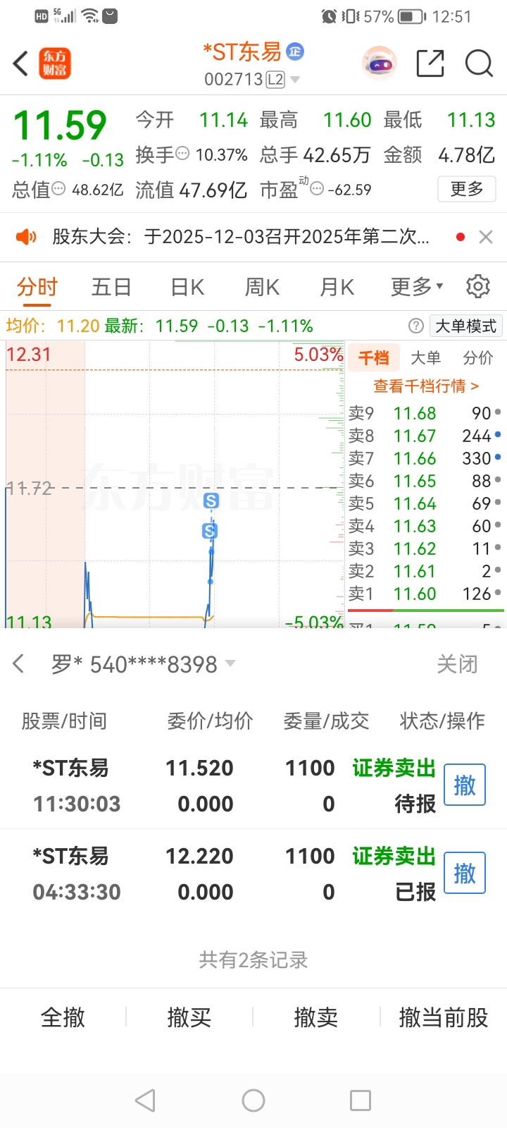 $*ST东易(SZ002713)$ 我挂了四笔卖单成交了两笔,现在想撤单都撤不回来了,感觉下午开盘会直线拉升!