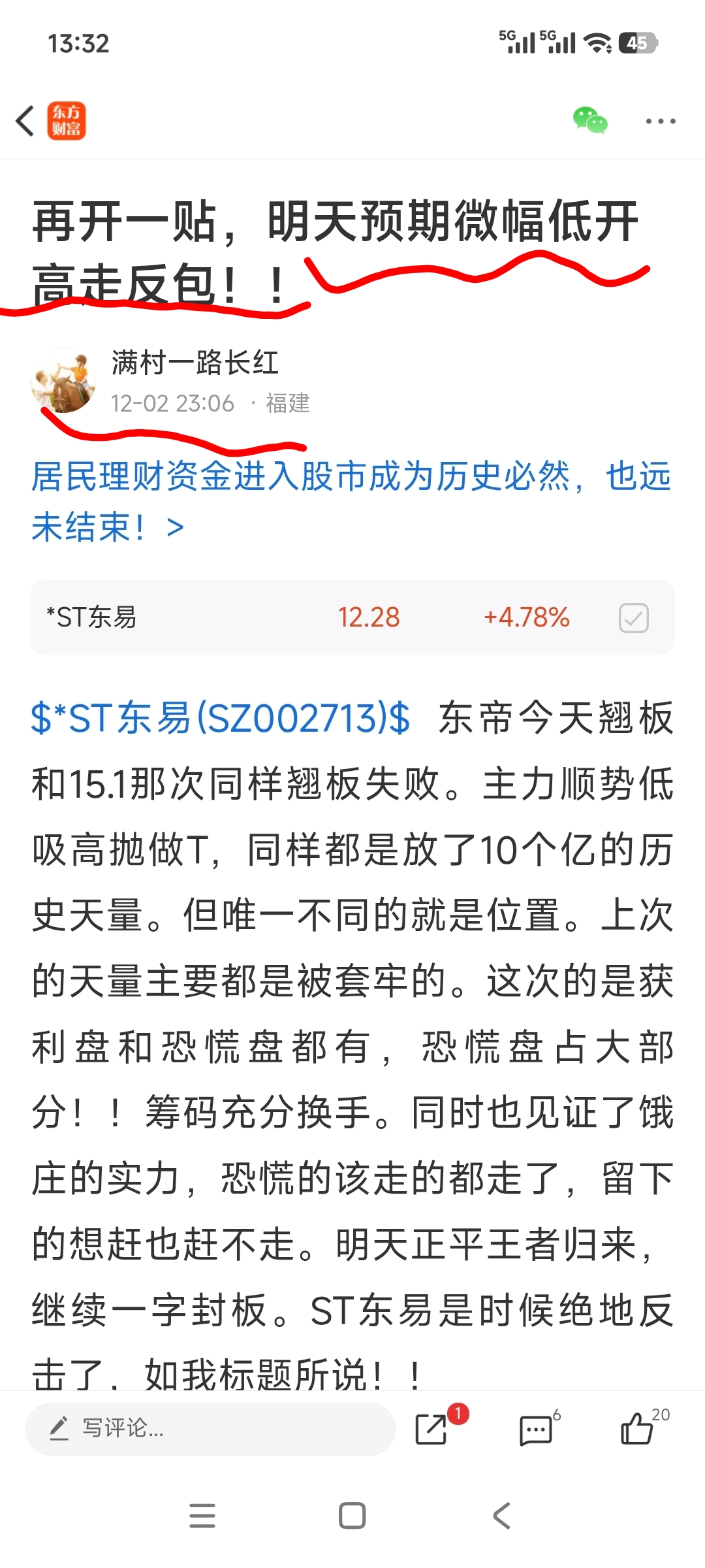 $*ST东易(SZ002713)$ 姐姐从不马后炮!!在所有大v都销声匿迹沉默的同时,大家都在恐慌。我不断的给大家打气。昨晚开的贴今天低开反包,一切符合预期!!给我捂好了。