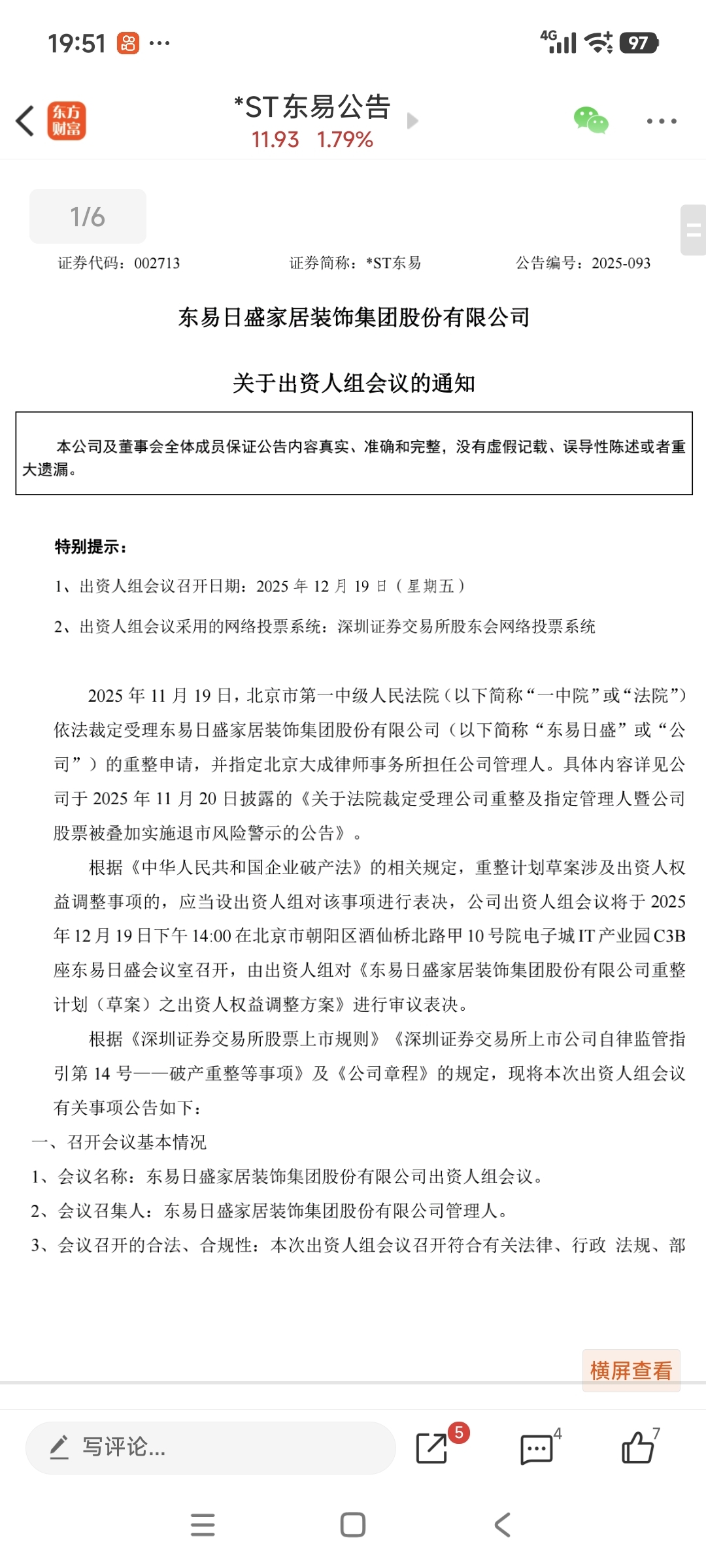 $*ST东易(SZ002713)$ 利好!出资人组会议日期公告,表决重整计划草案出资人组权益调整方案,说明重整计划草案已制定