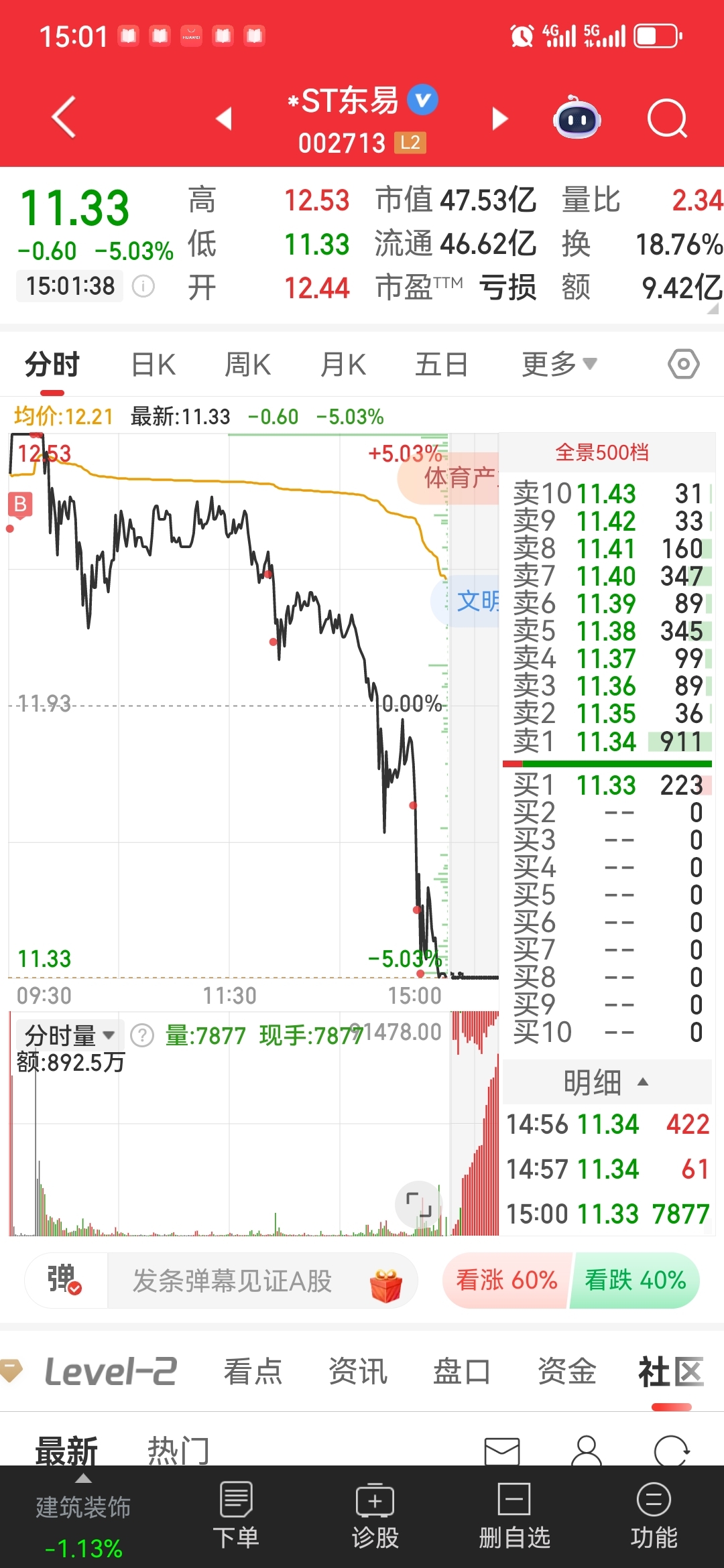 $*ST东易(SZ002713)$ 太狠了,我也是从涨停板加到跌停板