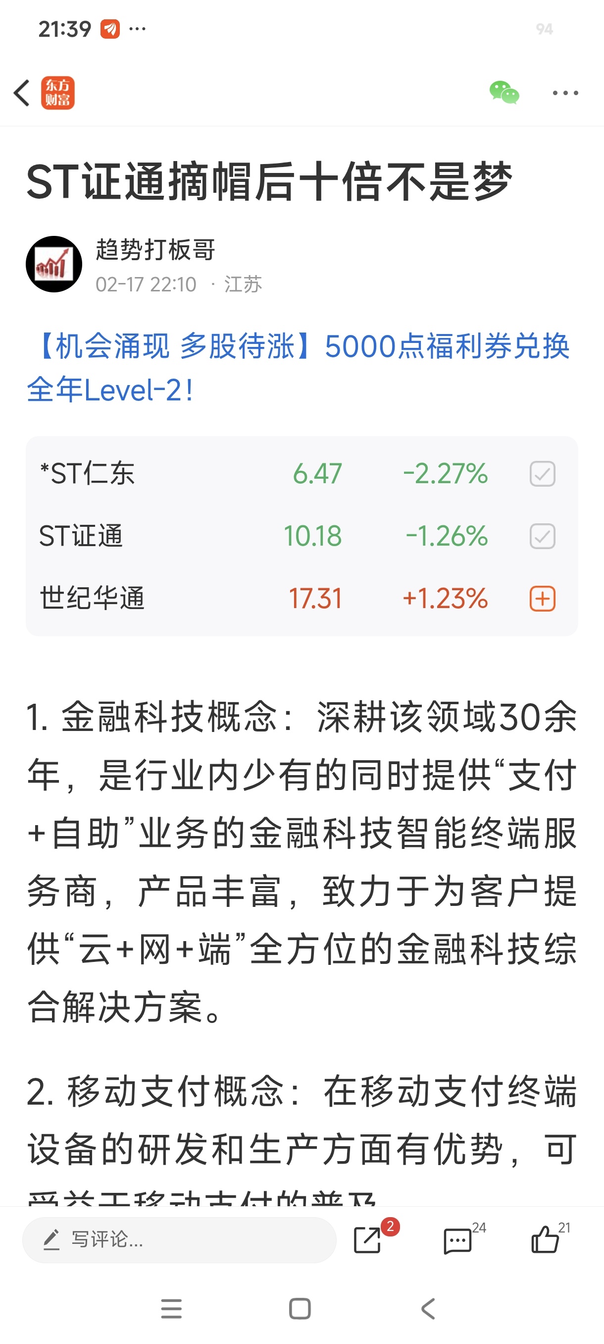 本人第一次推荐ST证通是在去年9.30日,那时候我是小仓位买入,第二次推荐证通的时候是在今年2.17日,那时候我已经打半仓了还好像亏了2万多,结果跟贴的没几个信也没几个人坚持到现在。