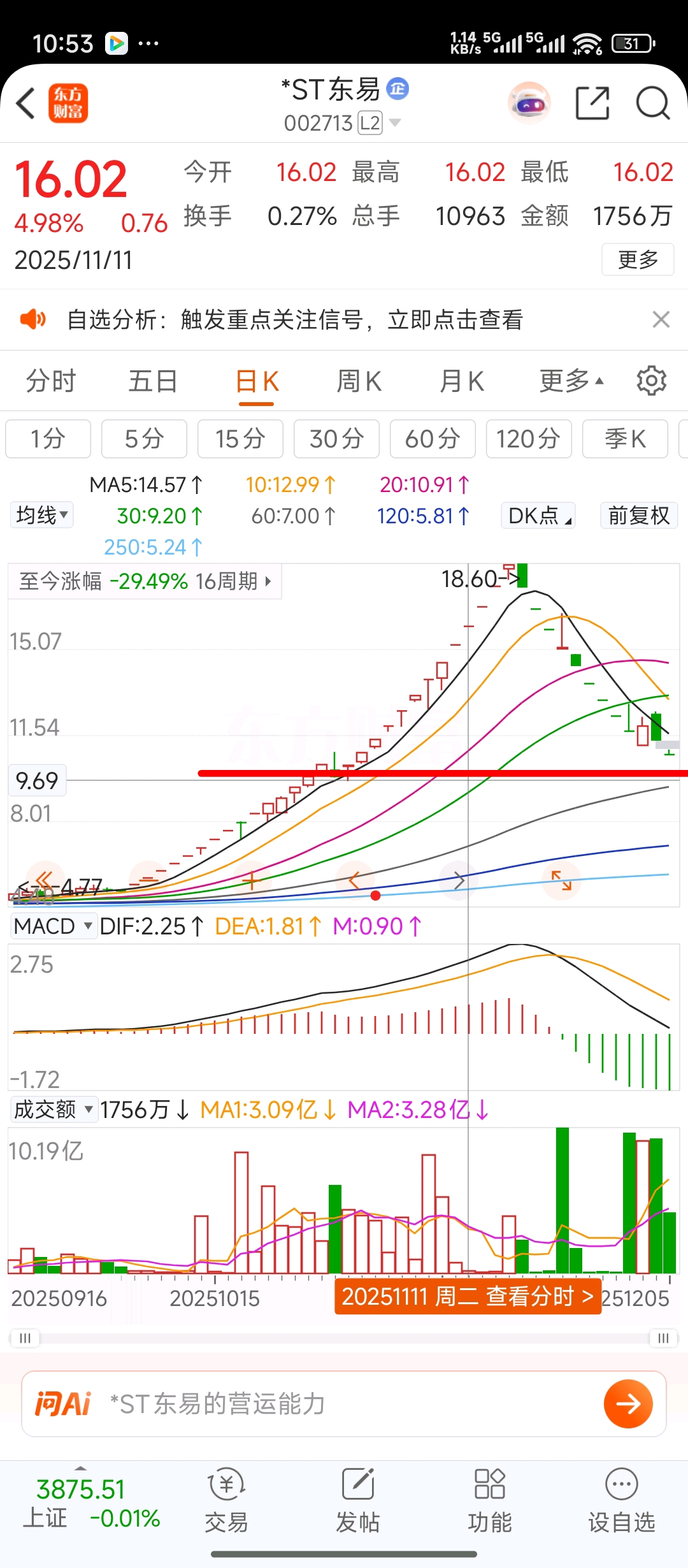 $*ST东易(SZ002713)$ 不是我看空,看这个下跌的趋势,极有可能得到60日线的位置,大约在9块5至9块6,也就是从18块6的最高点下跌50%的位置,或许在这里可以横盘,主力这么做的目的,大概是想除权,除的比例少一点,如果是这样的话,填权行情就大有可为,耐心等待吧