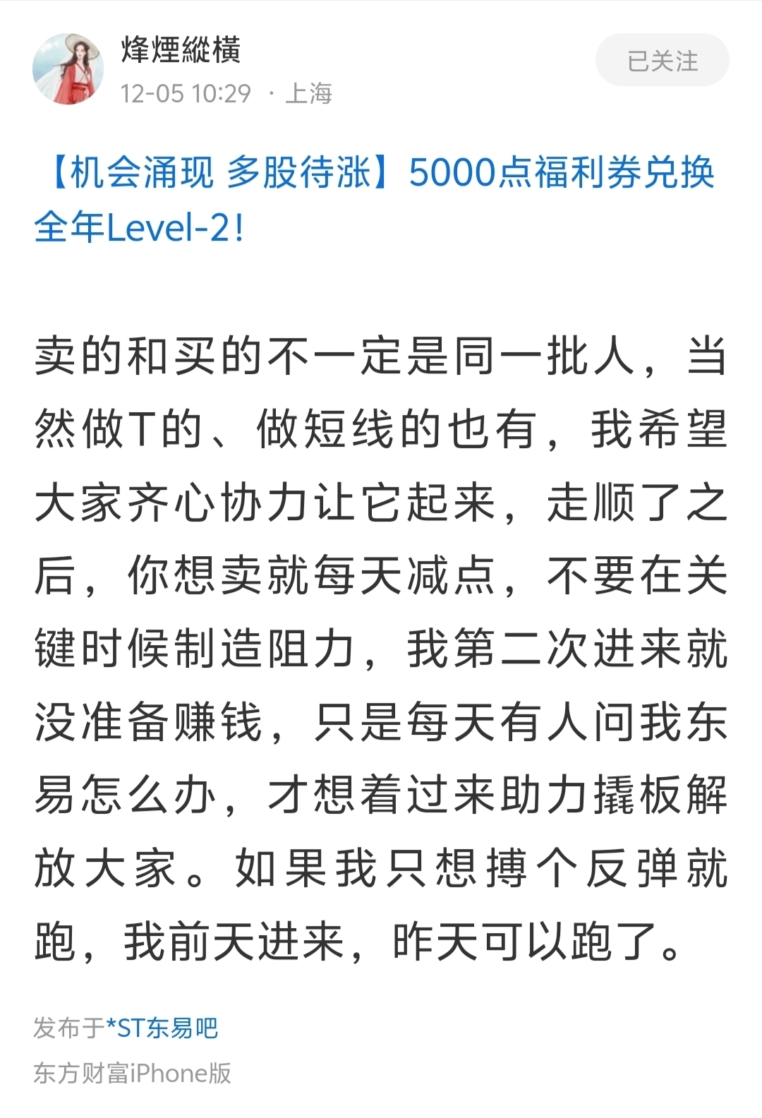 温馨提示: 1.根据《证券法》规定,禁止编造、传播虚假信息或者误导性信息,扰乱证券市场;2.用户在本社区发表的所有资料、言论等仅代表个人观点,与本网站立场无关,不对您构成任何投资建议。用户应基于自己的独立判断,自行决定证券投资并承担相应风险。《东方财富社区管理规定》