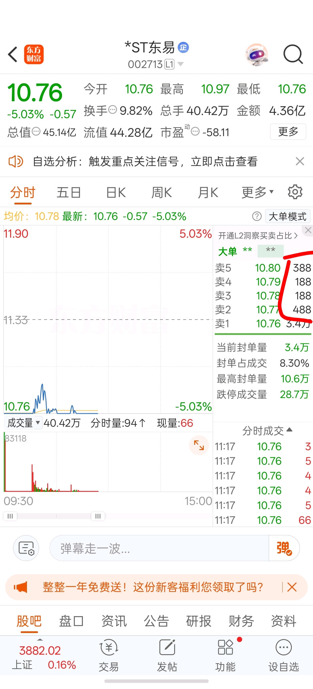 $*ST东易(SZ002713)$ 我不多说自己看图,可能是我瞎猜,我看了今天一共4次跌停开板,买二,买三,买四,买五的位置,基本都是这个,具体什么意思自己去搜(纯属瞎猜)