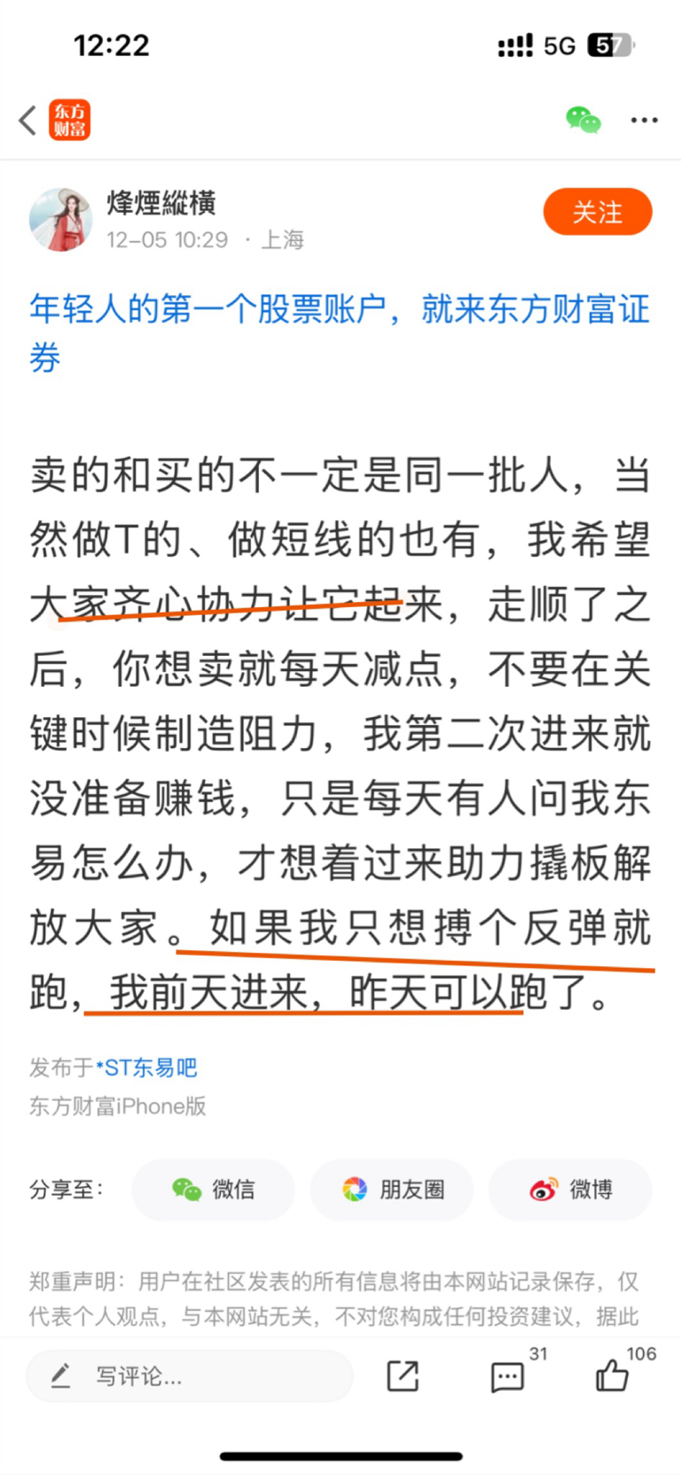$*ST东易(SZ002713)$ 做踢做的最欢的就是烽烟纵横,现在套住了,散户聪敏了,它买就砸,套在里面,居然就喊粉丝不要做踢了,要齐心协力,吗的齐心协力让它割肉吧。就是它在不停做踢,看看下图,在st合纵也是,一边小作文,一遍不停做踢,高低把那些春比粉挂住,然后又发帖自己溜了,大跌,那些春比粉丝割肉。它做踢,说自己一直在,从来不发持仓图实盘。