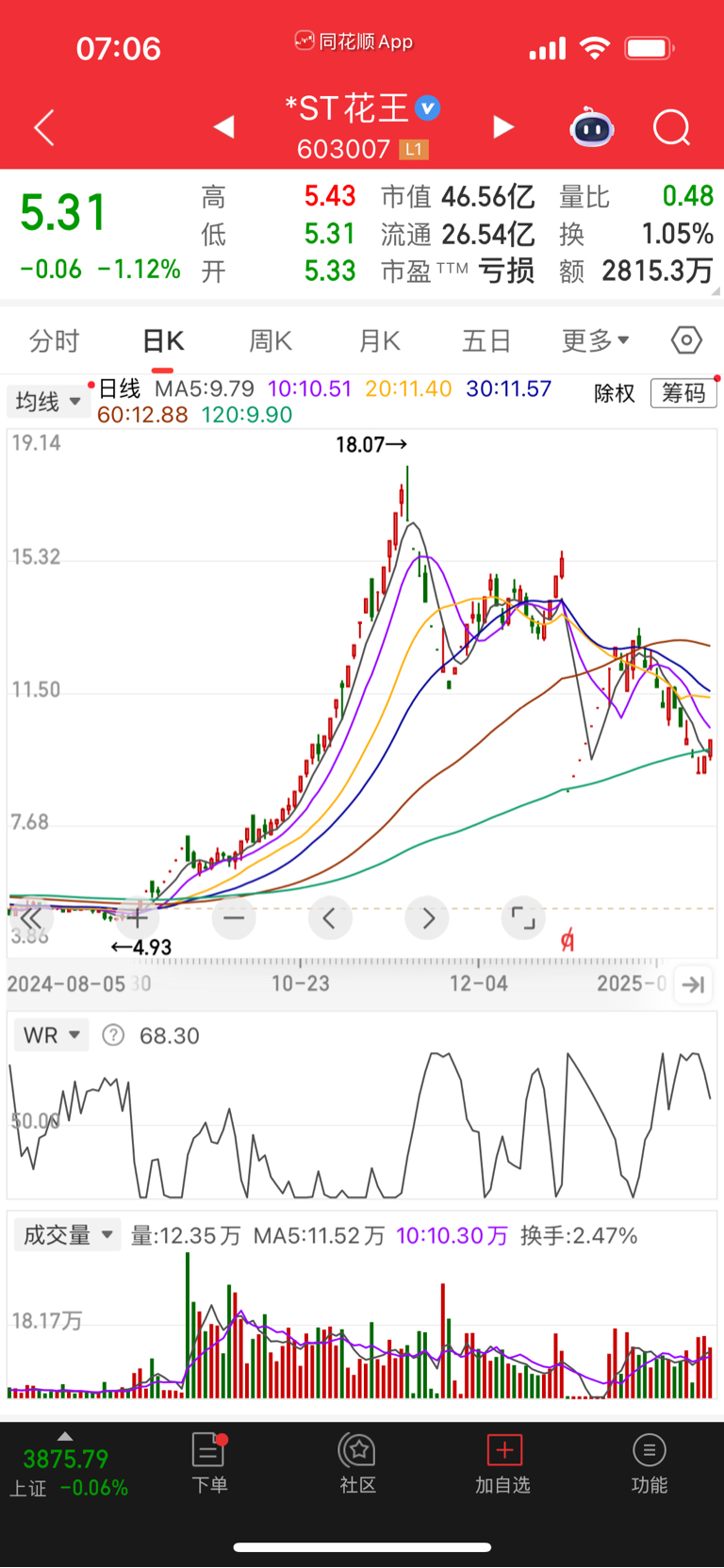 $*ST东易(SZ002713)$ 从走势和重整(预期除权进度等)时机看最象的st花王的借鉴意义,花王24年12月26日除权,股权从15块7除至8块多,在11月到12月间公司多次公告有“除权幅度约50 %的风险”,11月初中下旬在大幅上涨至18块后连续跌停到12块,然后一个停止跌停长上影+跌停(有点象东易最近两天),收在11块66,其后用近一个月时间,涨30 %到15块7。所以只要东易今天出计划,就有得玩,不出计划就鸟兽散了吧