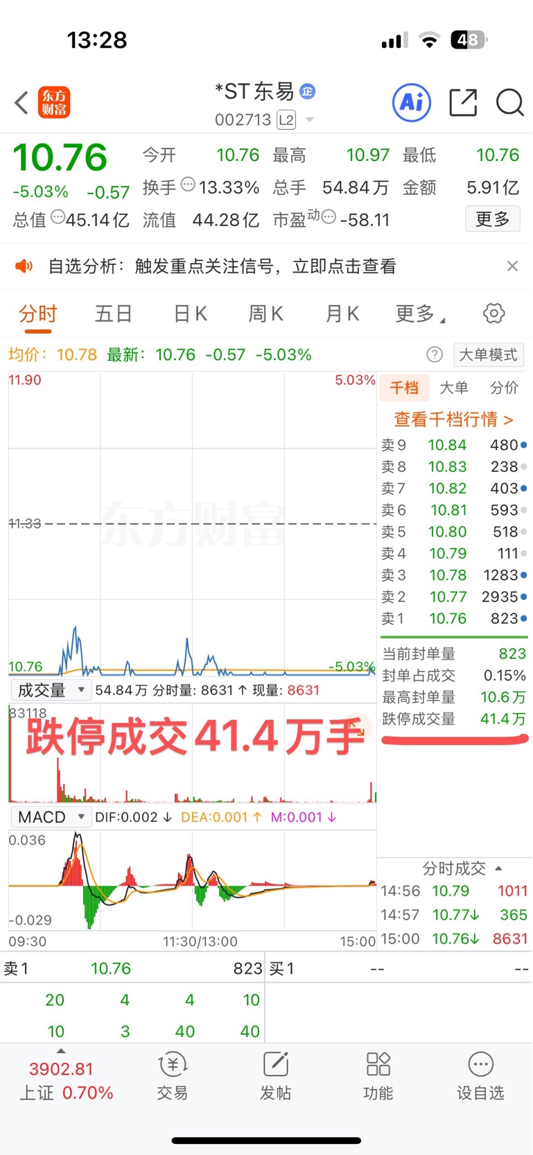 那么多唱空的,稳了!好多人被洗出去了,跌停成交41万手,筹码被主力扫光了,故意没拉升,因为晚上有公告,如果公告前拉涨停有内幕消息的嫌疑,所以说是涨停还是跌停,就看筹码在谁手里了,几十万手都收走了,难道是散户收的吗?有些什么都不懂的会被忽悠卖出,顶板早的可能还有机会抢到筹码,晚了汤也喝不上了
