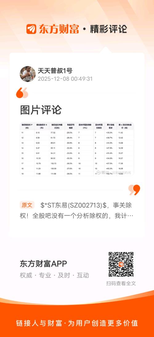 $*ST东易(SZ002713)$ ,事关除权!全股吧没有一个分析除权的,我计算了一下,是按照这个样子除权吗,多头来辩!我不做短线!