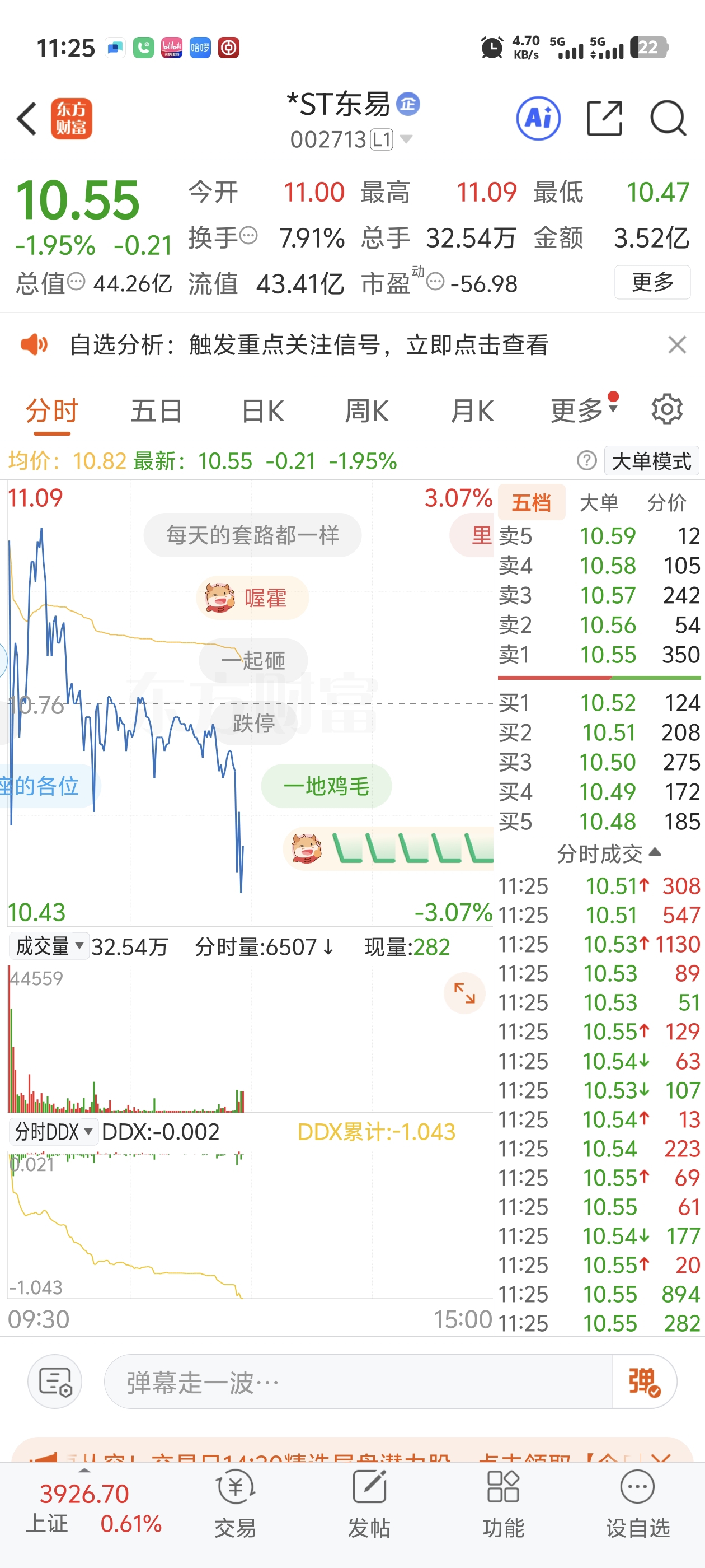 $*ST东易(SZ002713)$ 也太刺激了。今天波动有些大