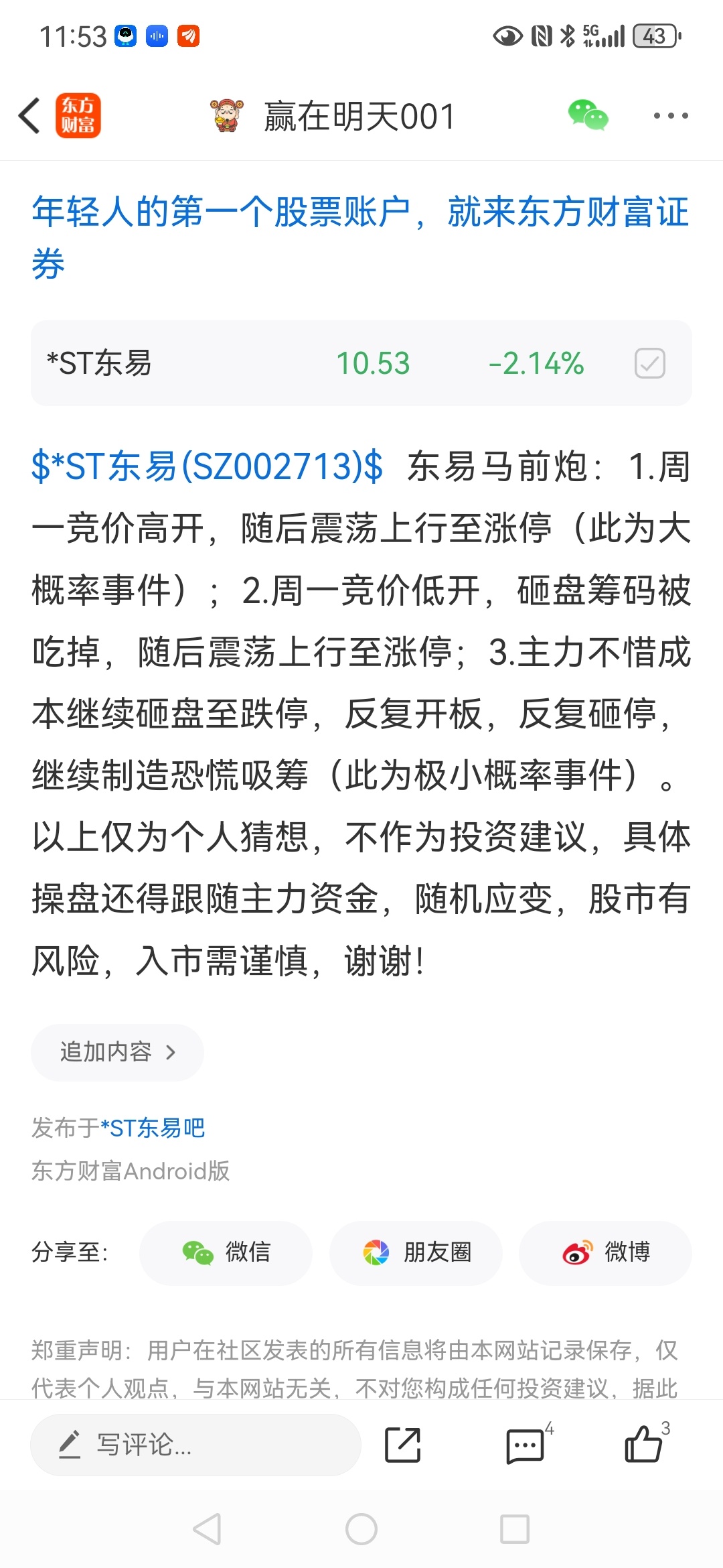 $*ST东易(SZ002713)$ 高位每天10个亿成交量的时候,主力资金已出货,现在就是一边砸一边吸,越恐慌越好吸。玩股票要用脑子,不要别人说什么就是什么。努力盯盘,用心分析,冷静操作。