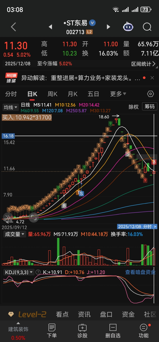 $*ST东易(SZ002713)$ 大意了,今天连我这种谨慎的多头都被埋了。套牢之多,抛压之重,疯狂多杀多,唉敬畏市场。