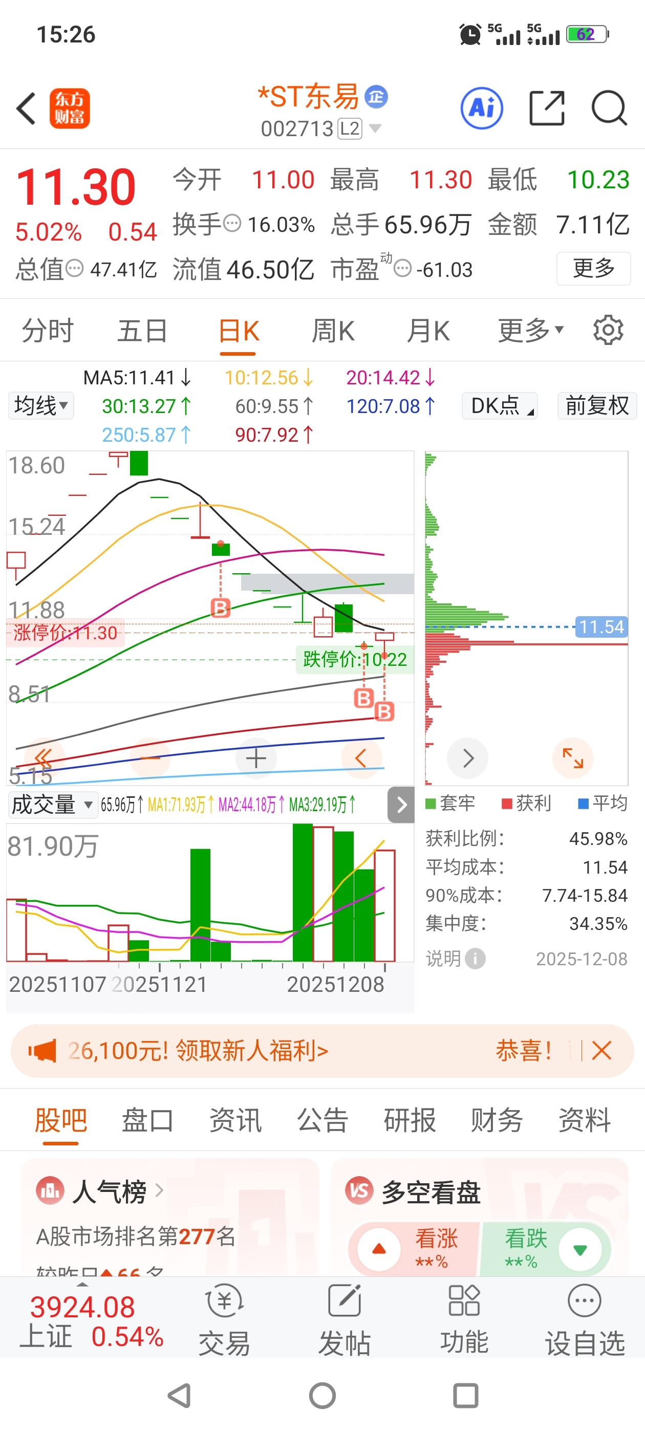 $*ST东易(SZ002713)$ 睡醒觉,主力没辜负我