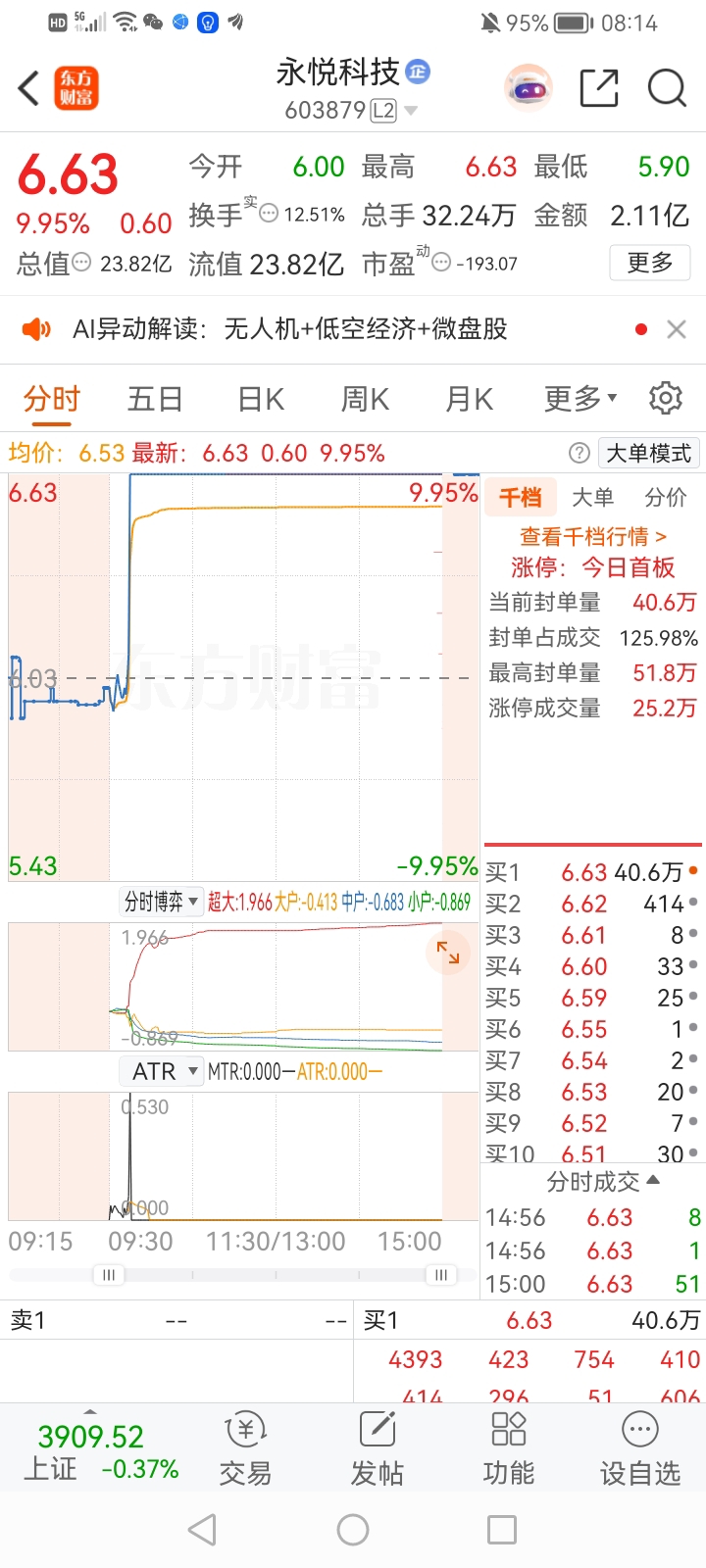 $*ST东易(SZ002713)$ $永悦科技(SH603879)$ 今天集合竞价清仓东易,以后下跌趋势的票决不抄底,东易的庄家太没底线了,十一个跌停板后还按跌停!以后只追涨!今天打板永悦科技,打板的理由是经过本人半年观察发现:早盘直线拉首板的票大概率能连续涨停板!打板比抄底的胜率大多了!