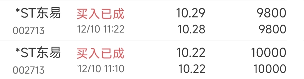 $*ST东易(SZ002713)$ 昨天说我是模拟的被几个人攻击了,反正钱是我的赚也好亏也好,大单委托都是做几笔成交的,现在我发几笔小的继续加仓
