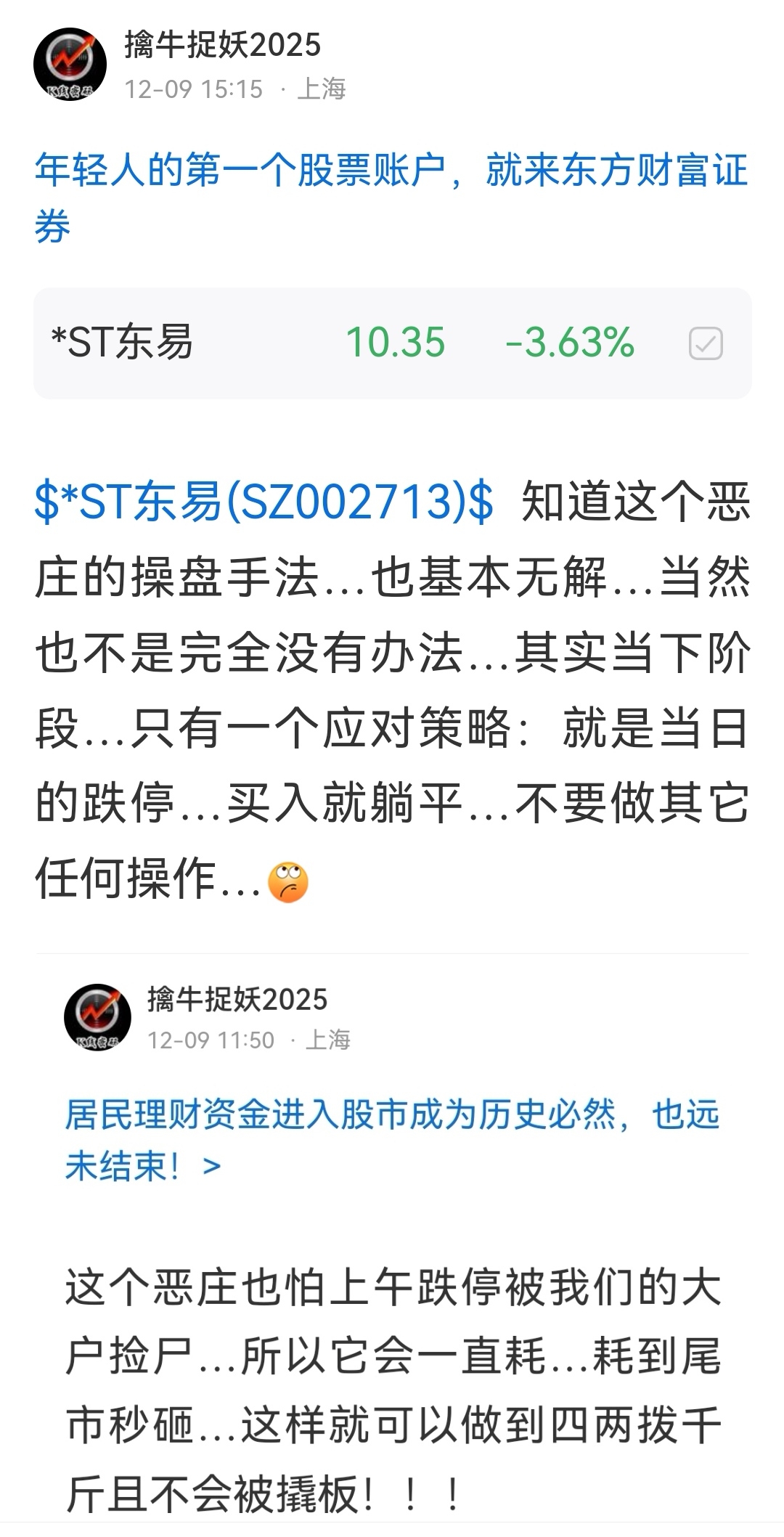 $*ST东易(SZ002713)$ 本人说过:近期针对恶庄的操作策略只有一条…其它时间你们的任何买卖都可被恶庄利用出货收货…不要以为恶庄只可低买高卖…它甚至可以短期内用高买低卖的方式来完成压价逼场内持筹者出局…这一点或许只有真正操过盘的业内人士才能理解!!!