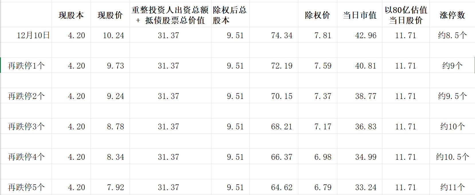 大佬们,看看我这个算得对吗,如果以重整后80亿估值算的话,填权价也也只能到11.