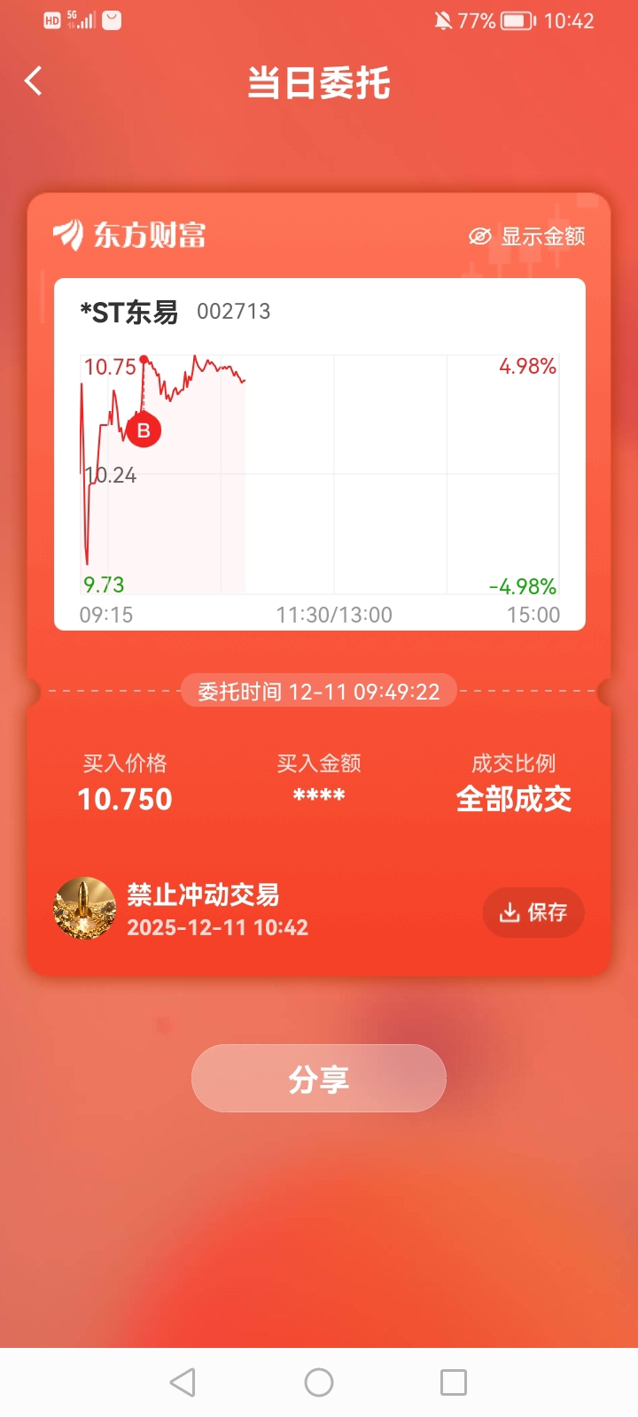 $*ST东易(SZ002713)$ 早上东易封涨停板的瞬间我就打板进来了,以为它要连续涨停板强势反弹!看来是我想太多了!